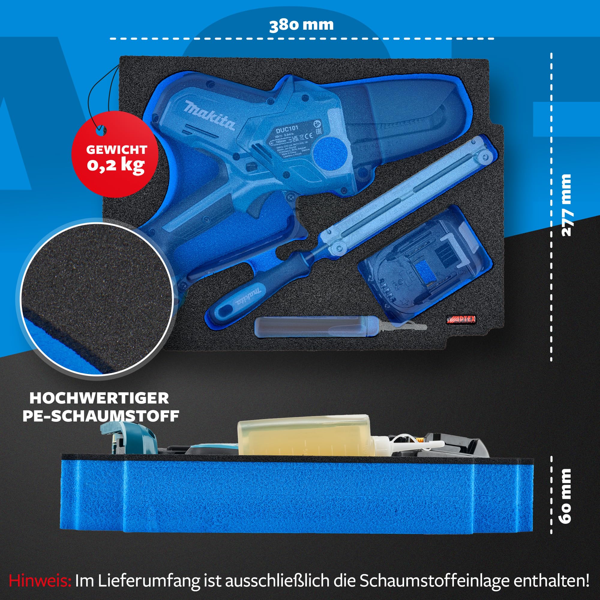 Wkładka piankowa do piły akumulatorowej Makita DUC 101 wyróżnia się doskonałą jakością wykonania oraz trwałością materiałów, co sprawia, że jest niezastąpionym dodatkiem dla każdego profesjonalisty, który dba o swoje narzędzia. Dzięki niej użytkownik może mieć pewność, że jego sprzęt jest odpowiednio zabezpieczony i gotowy do pracy w każdych warunkach.