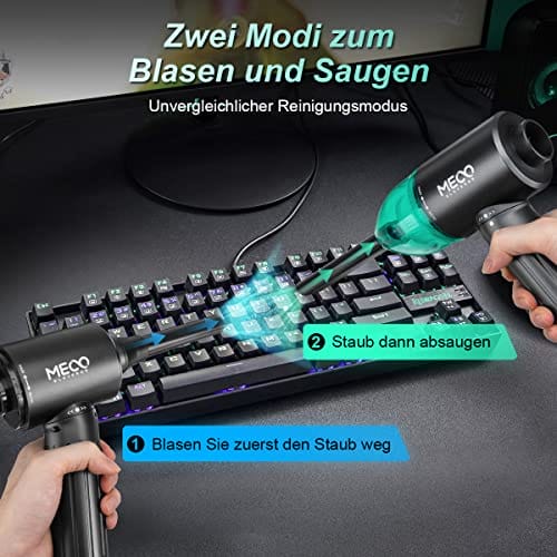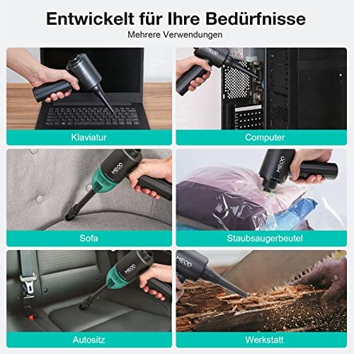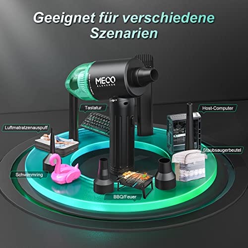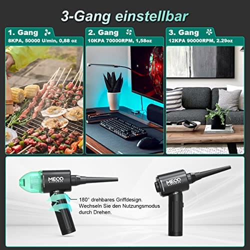 - 【Kraftvoller kabelloser Blasstaubsauger】Der MECO Staubgebläse kann in fast 10-stufigen starken Winden (25 m/s) einen starken Luftstrom erzeugen. Drehzahl kann bis zu 90000 U/min erreichen, Saugkraft bis zu 12000 PA. Es kann sowohl blasen als auch saugen und ist ausreichend, um Ihr Haus, Ihr Auto und Ihre Computertastatur gründlich zu reinigen, außerdem kann es Ihre Matratze schnell aufblasen. Ausgestattet mit einem einzigartigen bürstenlosen Motor, ist die Saugkraft stärker und die Lebensdauer länger.