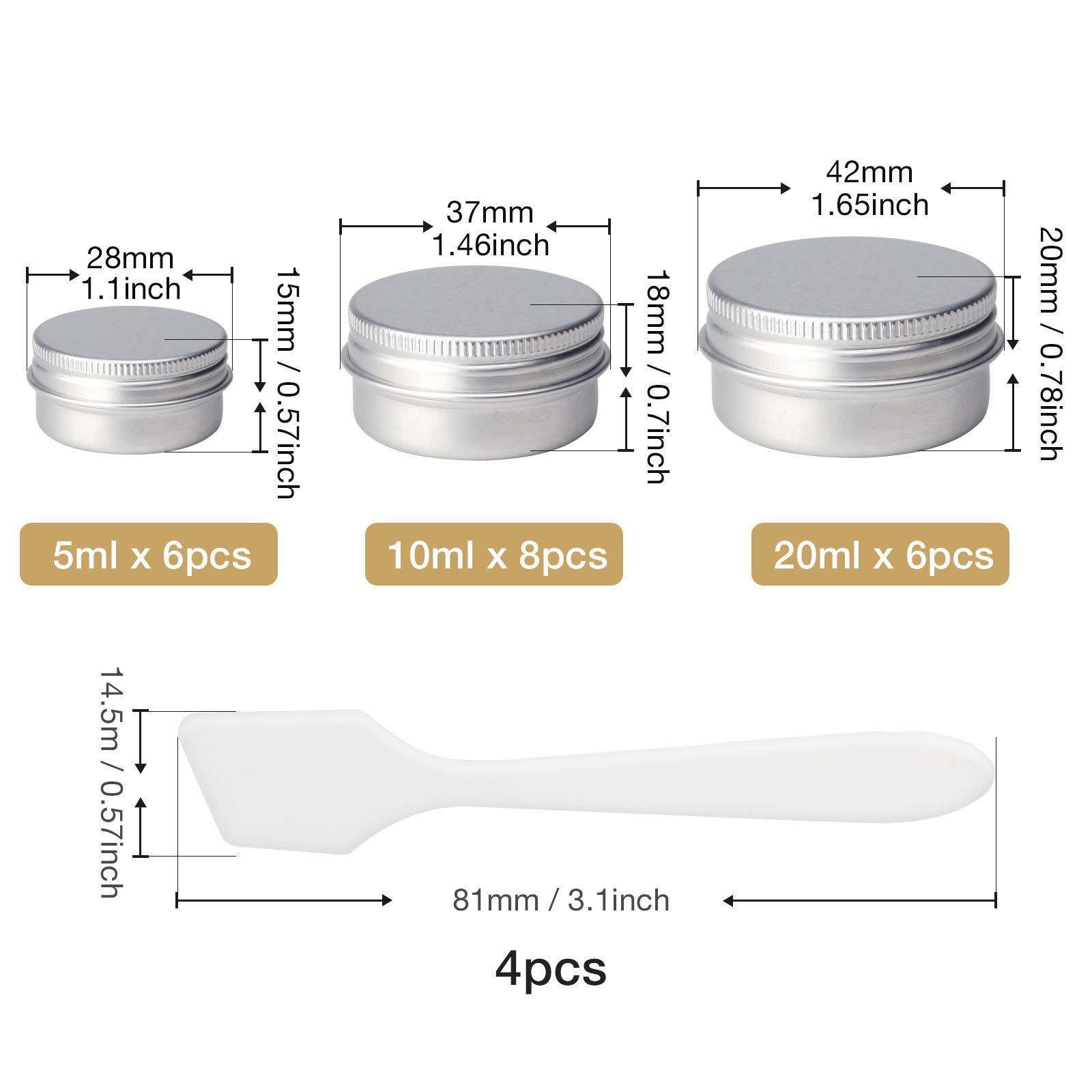 ✅ Opakowanie zawiera: zestaw: Opakowanie zawiera: zestaw garnków na próbki zawiera 20 aluminiowych słoików o 3 różnych pojemnościach (6 szt. 5 ml, 8 szt. 10 ml, 6 szt. 20 ml) i 4 mini skrobaki. Oferujemy również 24 naklejki z etykietami, które pomogą Ci oznaczyć rzeczy.