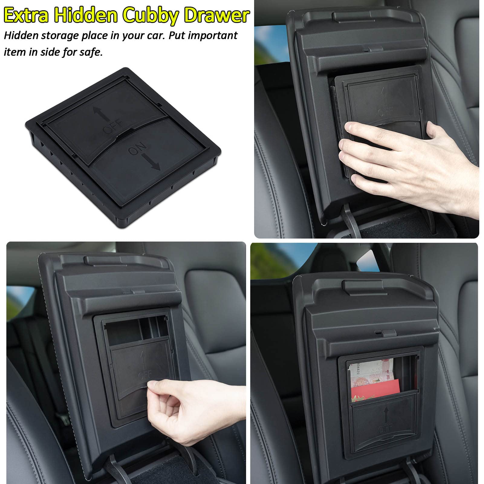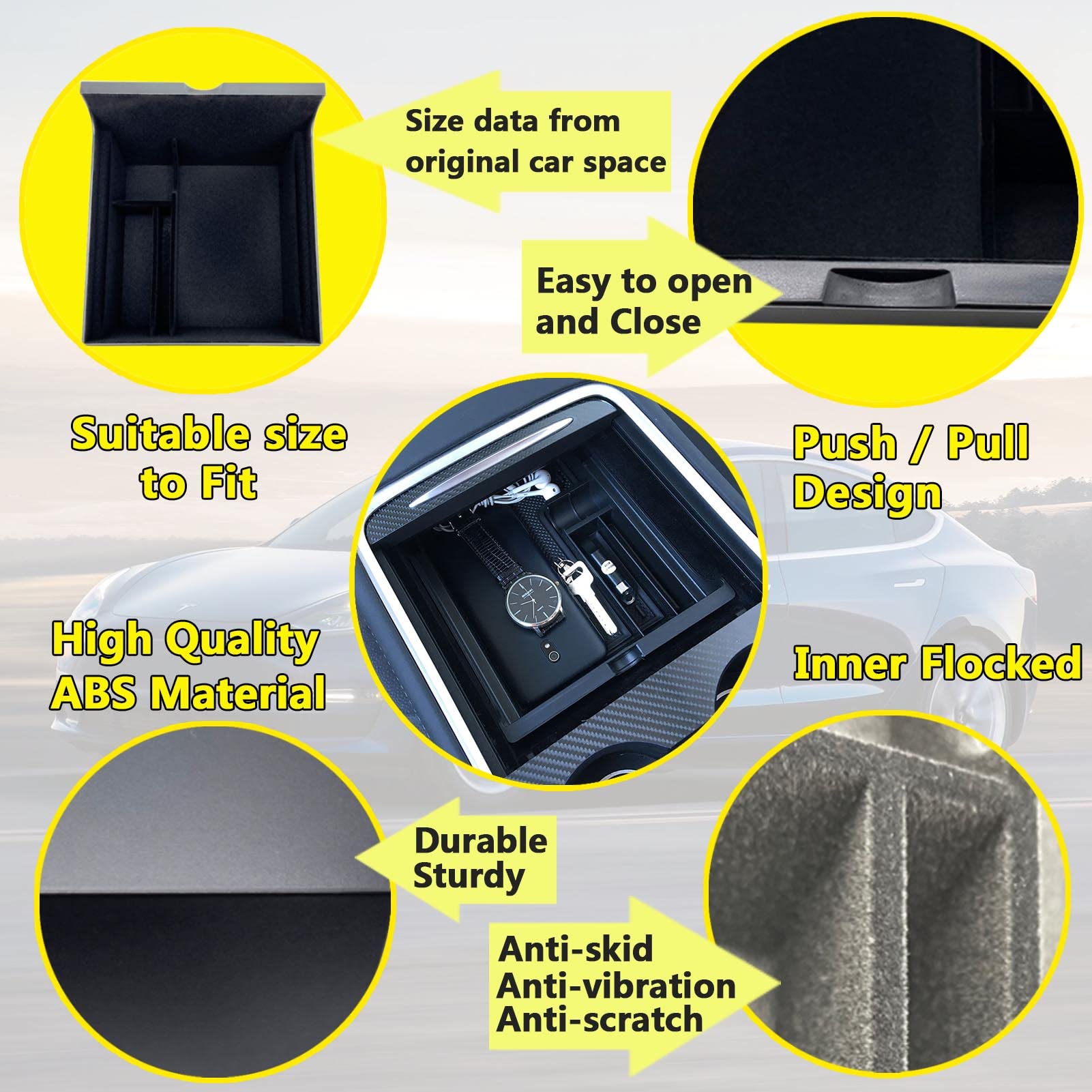 * Miękki w: * Miękki w dotyku z wewnętrznym flokowanym materiałem wyściółki, 2 szt. Taca do przechowywania konsoli środkowej dla modelu 3 Y są flokowane wewnętrznie, bez zadrapań na przedmiot, taki jak szkło, słuchawki, karta, klucze, telefony, monety, pamięć USB i tak dalej. Ukryta szuflada pod podłokietnikiem