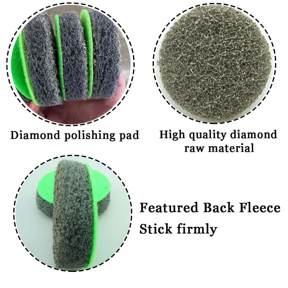 • Trwały materiał – podkładki polerskie są wykonane z wysokiej jakości włókien i proszku diamentowego impregnowanego żywicą wysokotemperaturową. Ostra i odporna na zużycie, może być stosowana na płaskich powierzchniach, zakrzywionych powierzchniach lub krawędziach. Szybko poleruje i trwa długo.