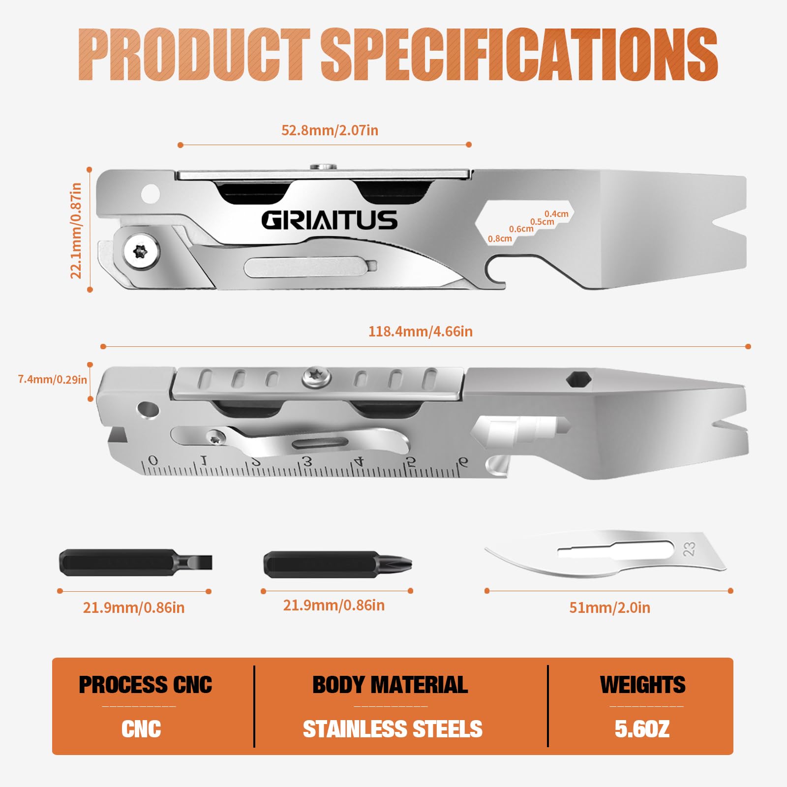 • Dołączone części składowe: ‎klucz, stopka, otwieracz do butelek, skalpel z 10 zapasowymi ostrzami, dźwignią, wyciągiem gwoździa, linijką, śrubokrętem płaskim, krzyżakiem