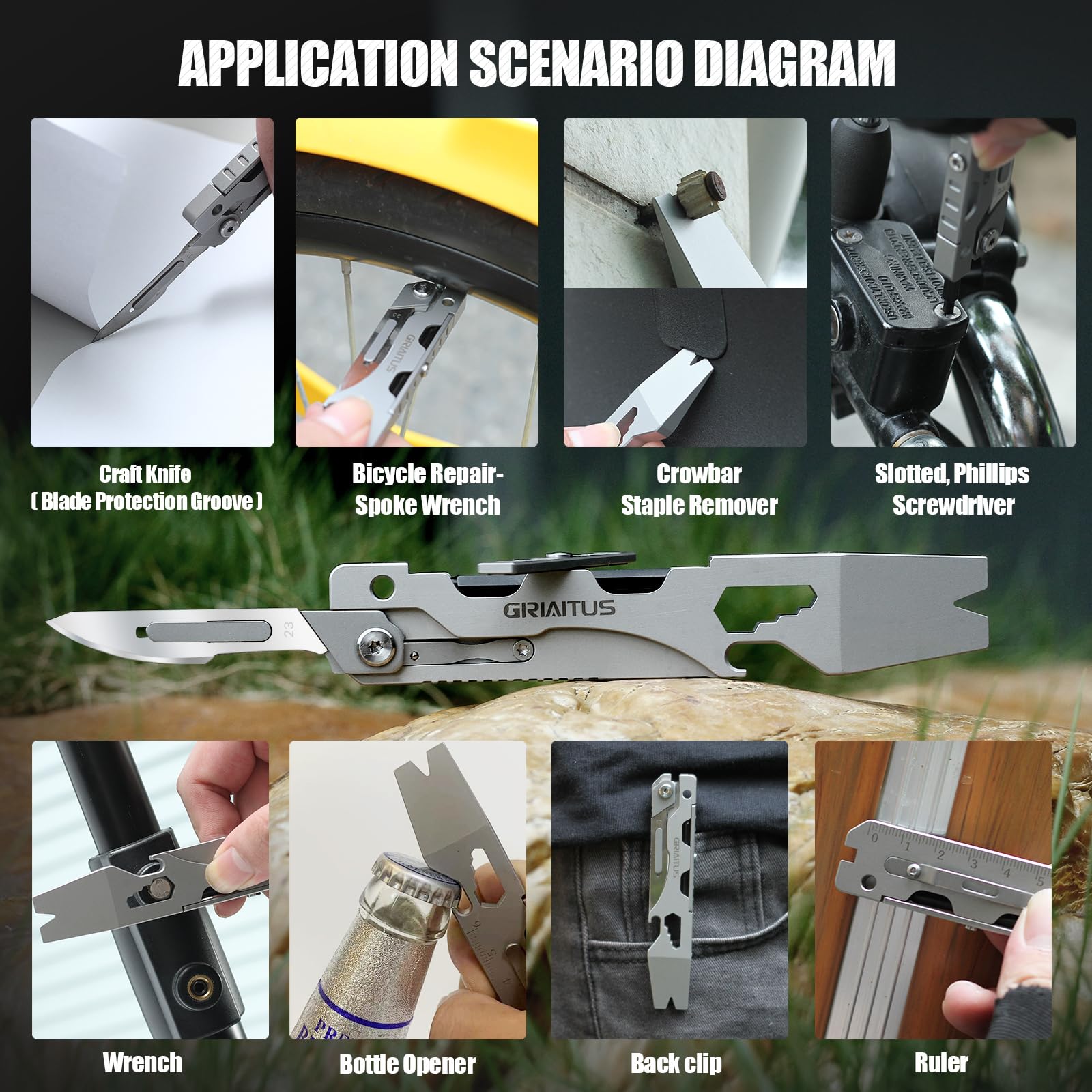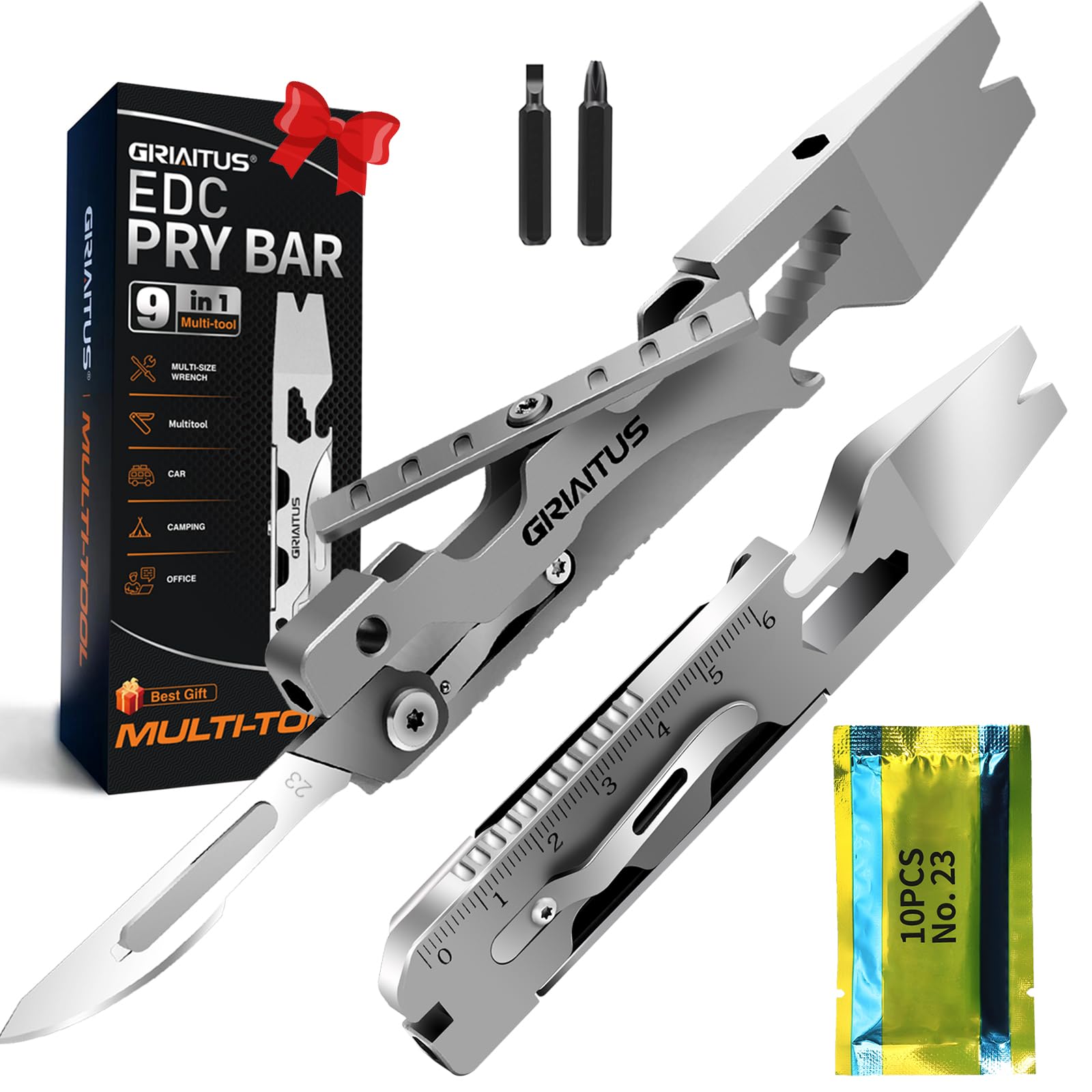 ⚒️Narzędzie wielofunkcyjne 9: ⚒️Narzędzie wielofunkcyjne 9 w 1: klucz, łom, otwieracz do butelek, skalpel (z 10 wymiennymi ostrzami), dłuto, wyciągacz gwoździ, linijka, śrubokręt płaski, śrubokręt krzyżakowy, wykracza poza podstawowe funkcje i posiada szereg przydatnych funkcji.