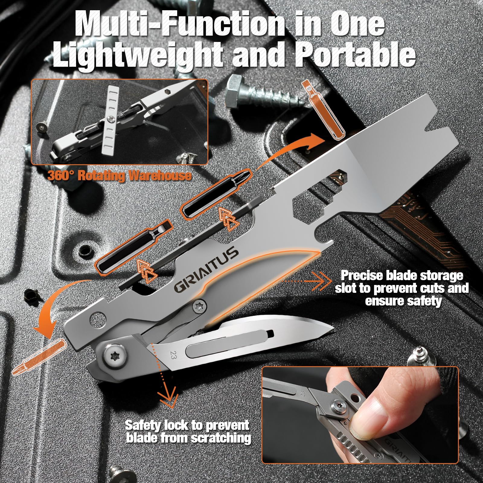 📍Innowacyjny design: Wyróżnij: 📍Innowacyjny design: Wyróżnij się dzięki unikalnej cesze. Narzędzie wielofunkcyjne wyposażone jest w płaską głowicę i końcówkę krzyżakową i można je bezpiecznie przechowywać w obrotowym o 360° schowku. Ta innowacyjna konstrukcja pozwala na bezpieczne zamocowanie dwóch dołączonych końcówek śrubokręt