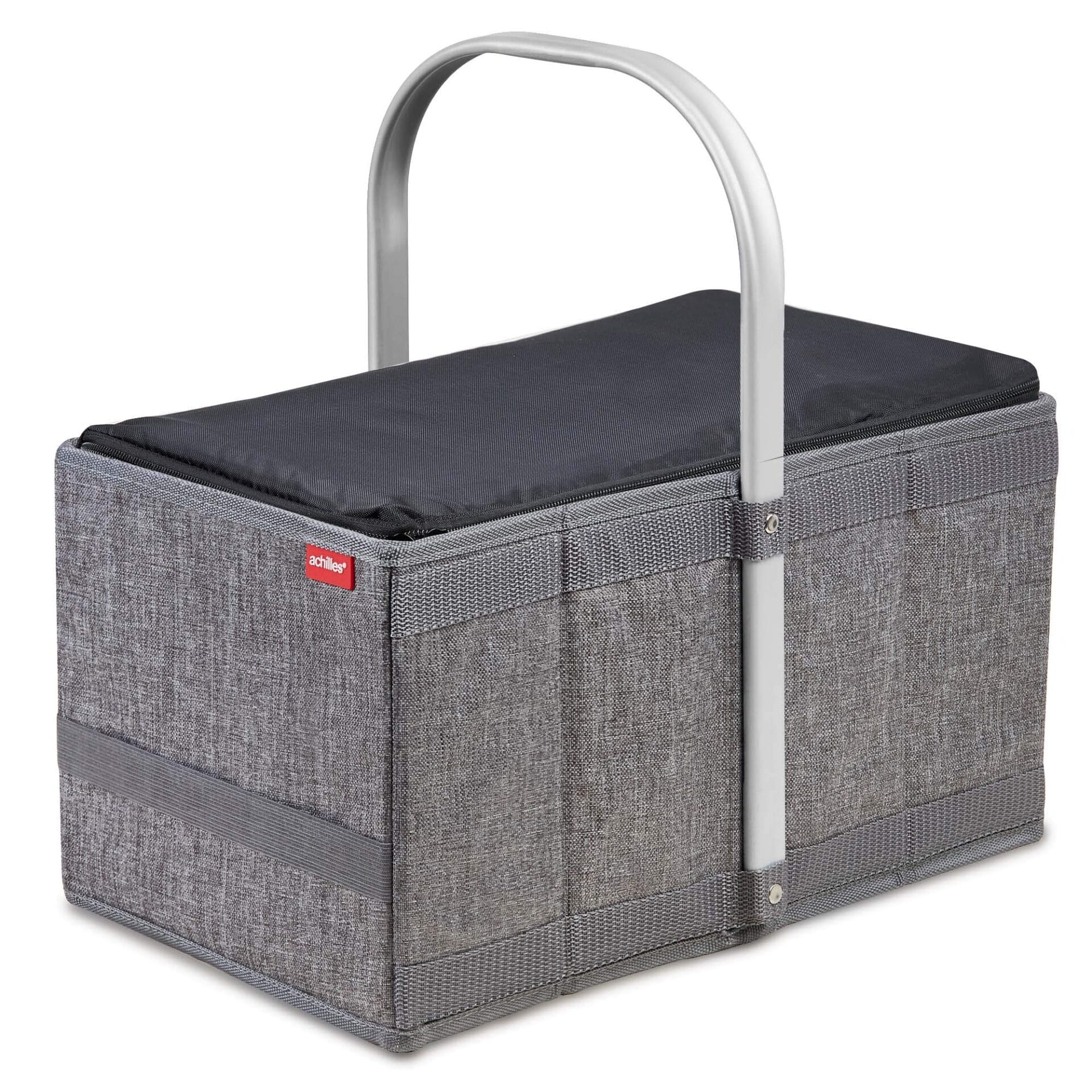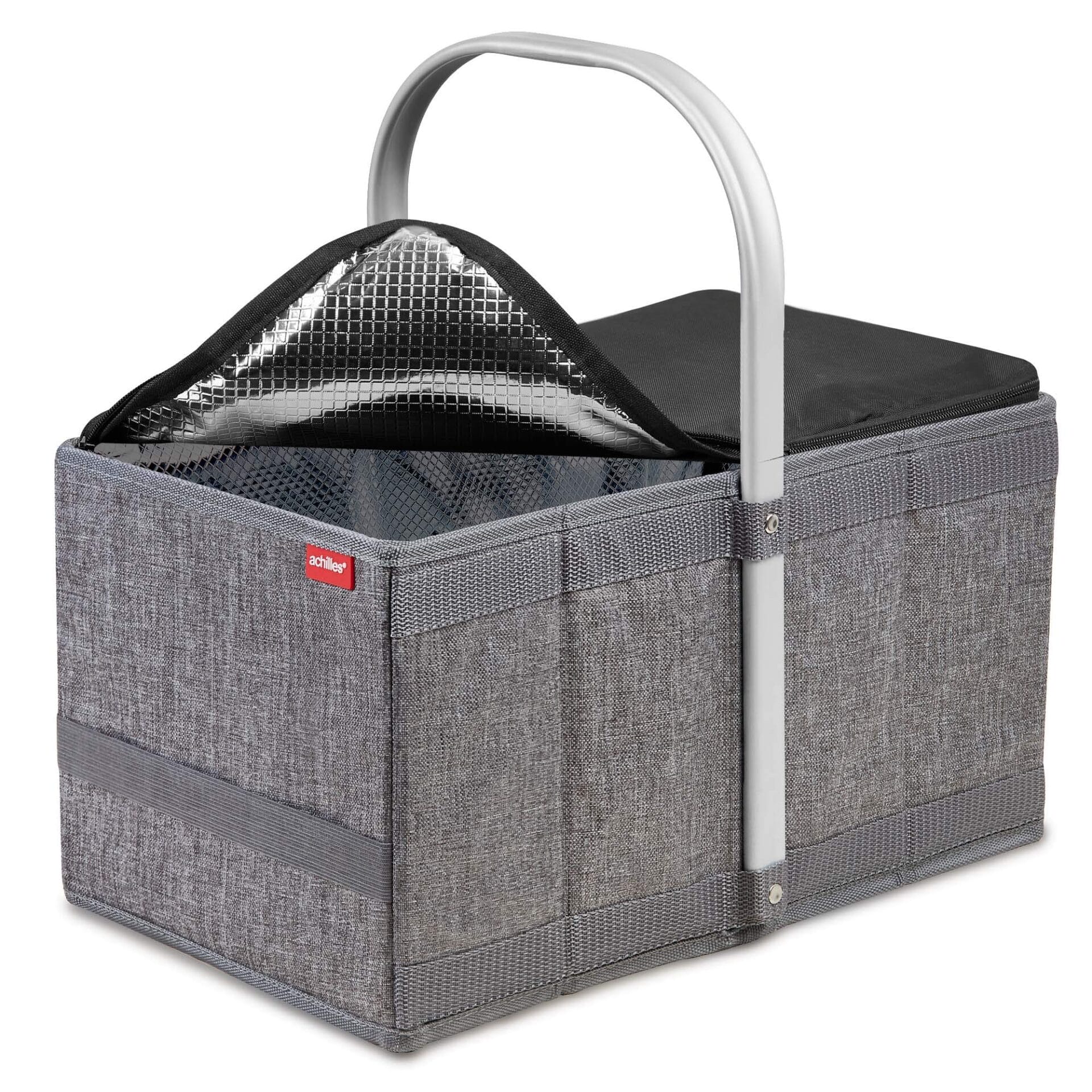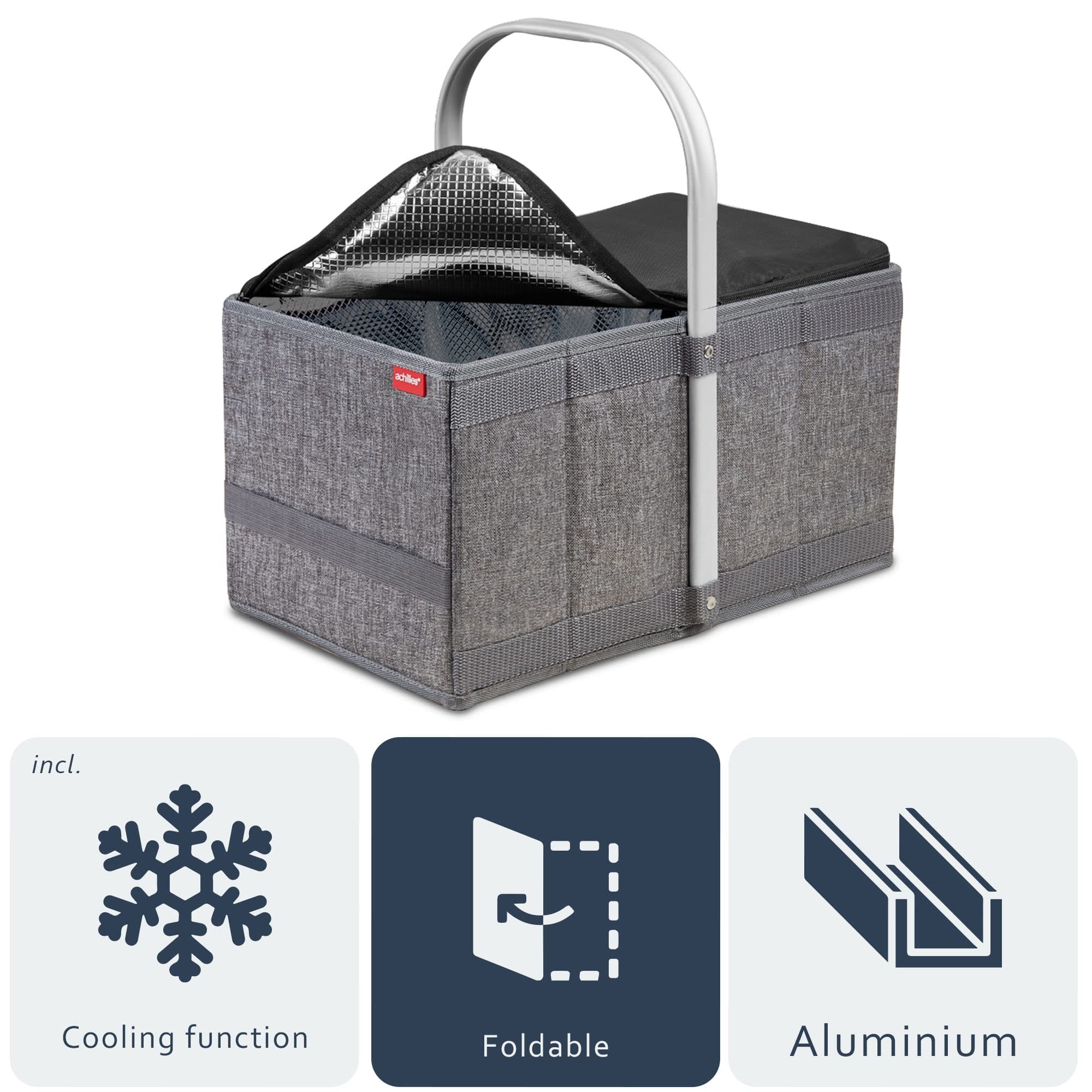 achilles Handle-Box Cool to składany koszyk na zakupy z wkładką chłodzącą, który jest kompletnym przewodnikiem dla klienta. Ten stylowy koszyk marki achilles został wykonany z wytrzymałego poliestru, posiada aluminiową rączkę i wkładkę chłodzącą, co czyni go idealnym towarzyszem podczas zakupów lub pikników na świeżym powietrzu.