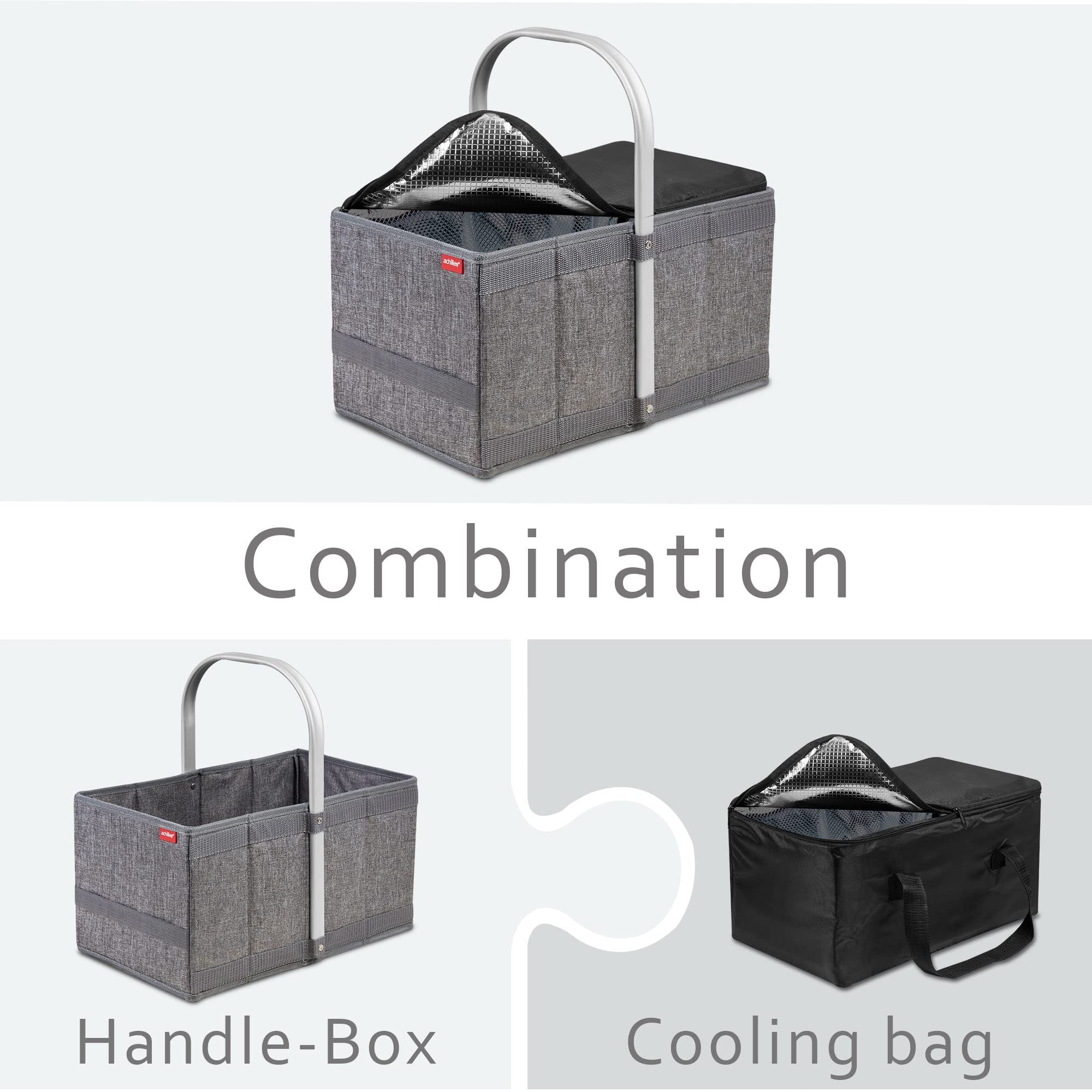 Głównym elementem Handle-Box jest aluminiowy uchwyt, który pozwala na swobodne rozłożenie koszyka za pomocą kilku prostych ruchów. Koszyk jest również wyposażony w wkładkę chłodzącą. Duża główna komora koszyka ma pojemność do 14 litrów. Wodoodporna powierzchnia z wytrzymałego poliestru jest dobrze izolowana i łatwa do czyszczenia.