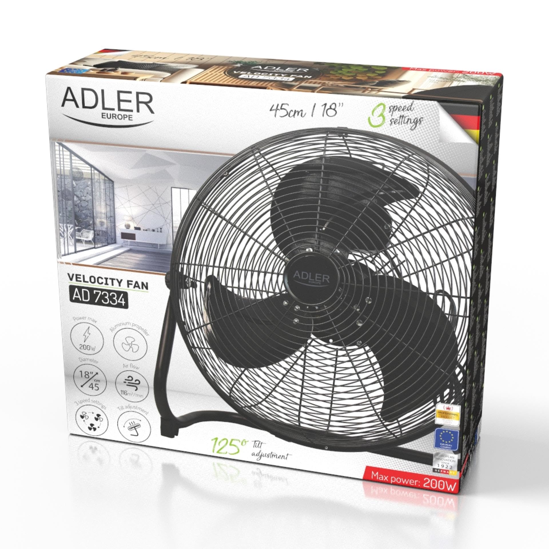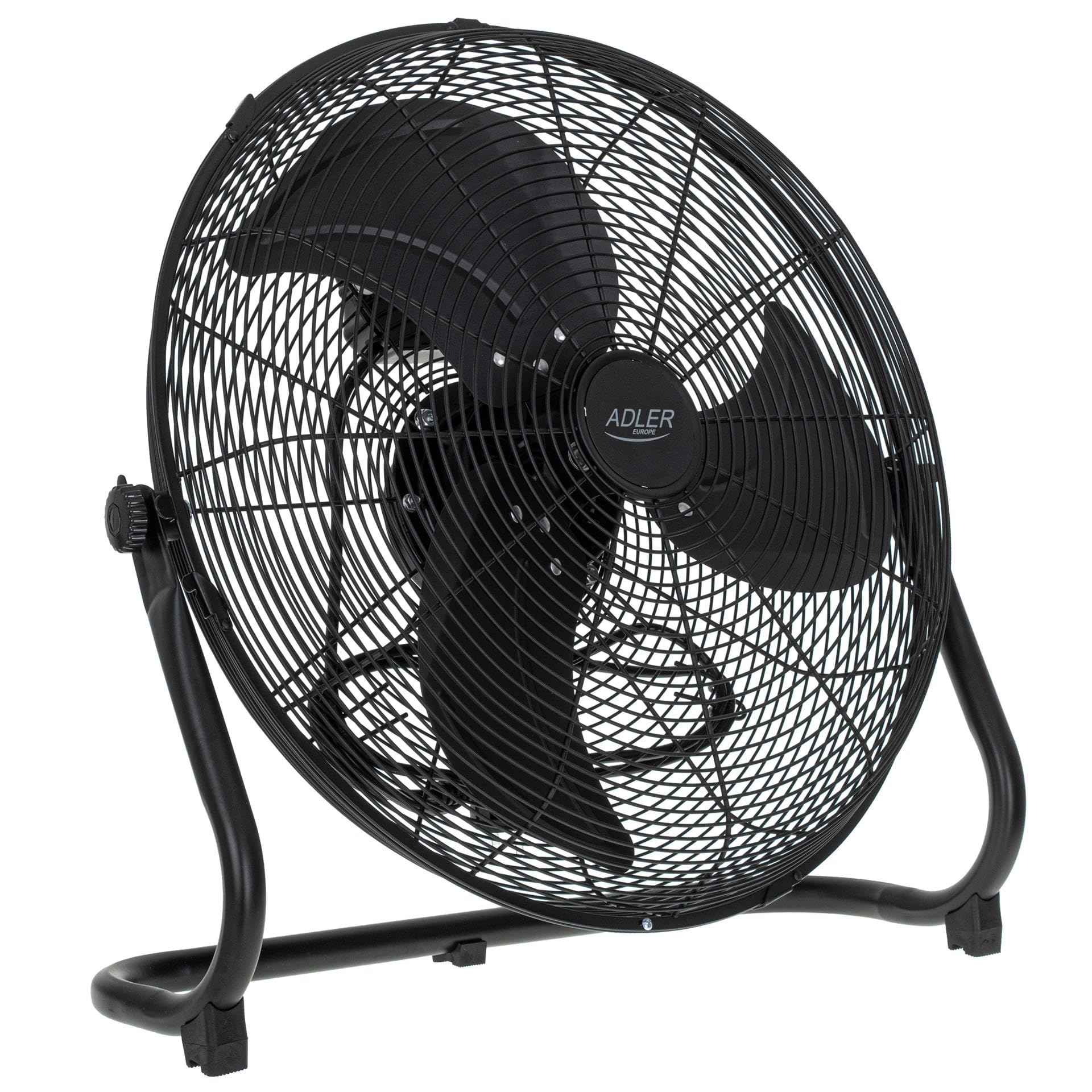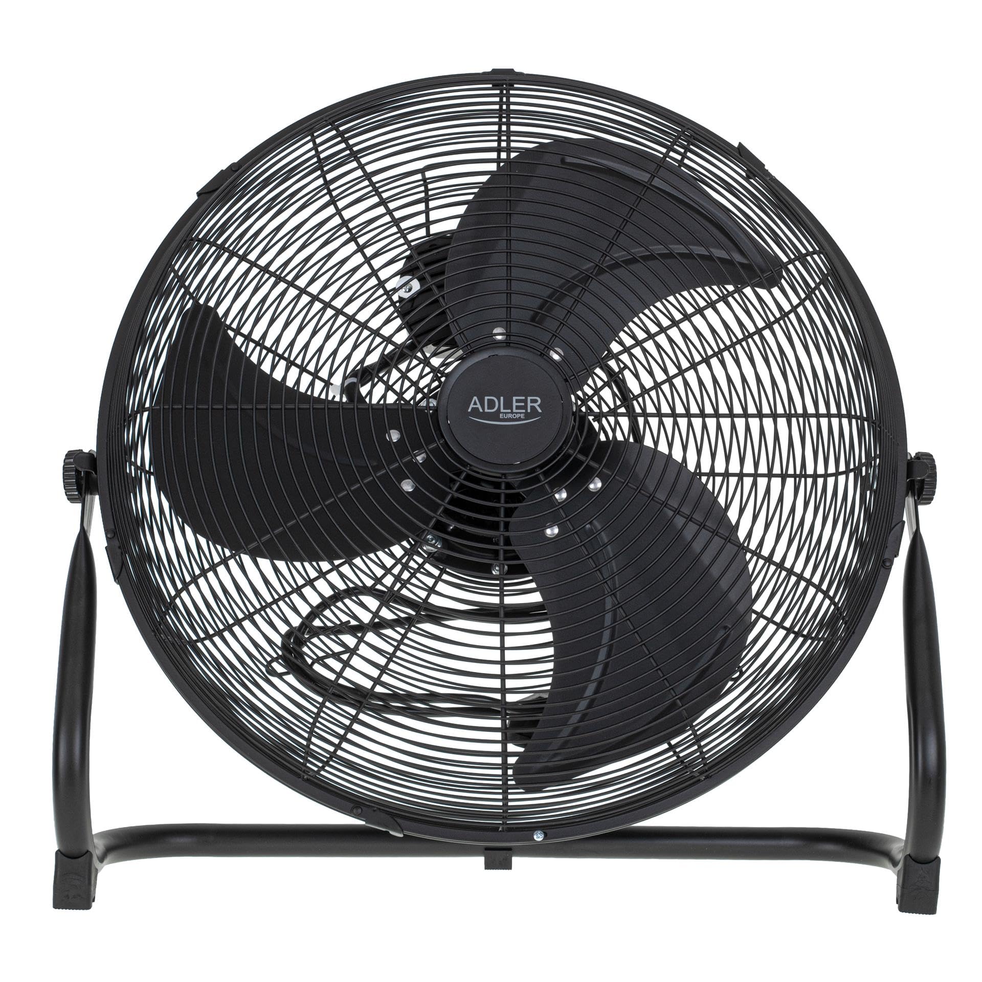 ADLER EUROPE Wentylator podłogowy 45 cm i 200 W – wentylator w kolorze chromu, 3 prędkości – wiatrak z aluminiowym skrzydłem – cichy i stabilny – wentylator podłogowy, czarny