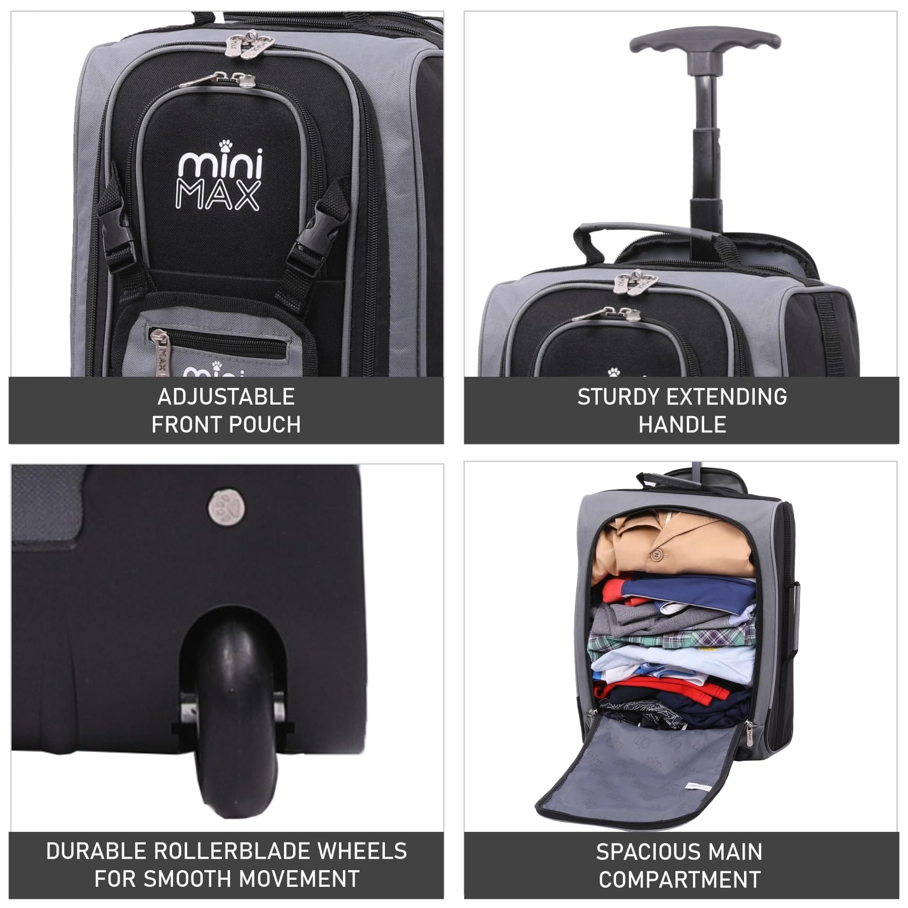 Jedną z głównych cech tej torby jest jej wszechstronny design. Wyposażona w 2 łatwo poruszające się kółka i wysuwany uchwyt, torba ta może być łatwo prowadzona na kółkach. Może również być noszona jako plecak, dzięki regulowanym paskom, które można dostosować do dzieci. Paski plecaka można schować w kieszeni na zamek błyskawiczny, a kieszeń plecaka można złożyć pod torbą, aby zakryć koła i zapobiec zabrudzeniu ubrań podczas noszenia torby.