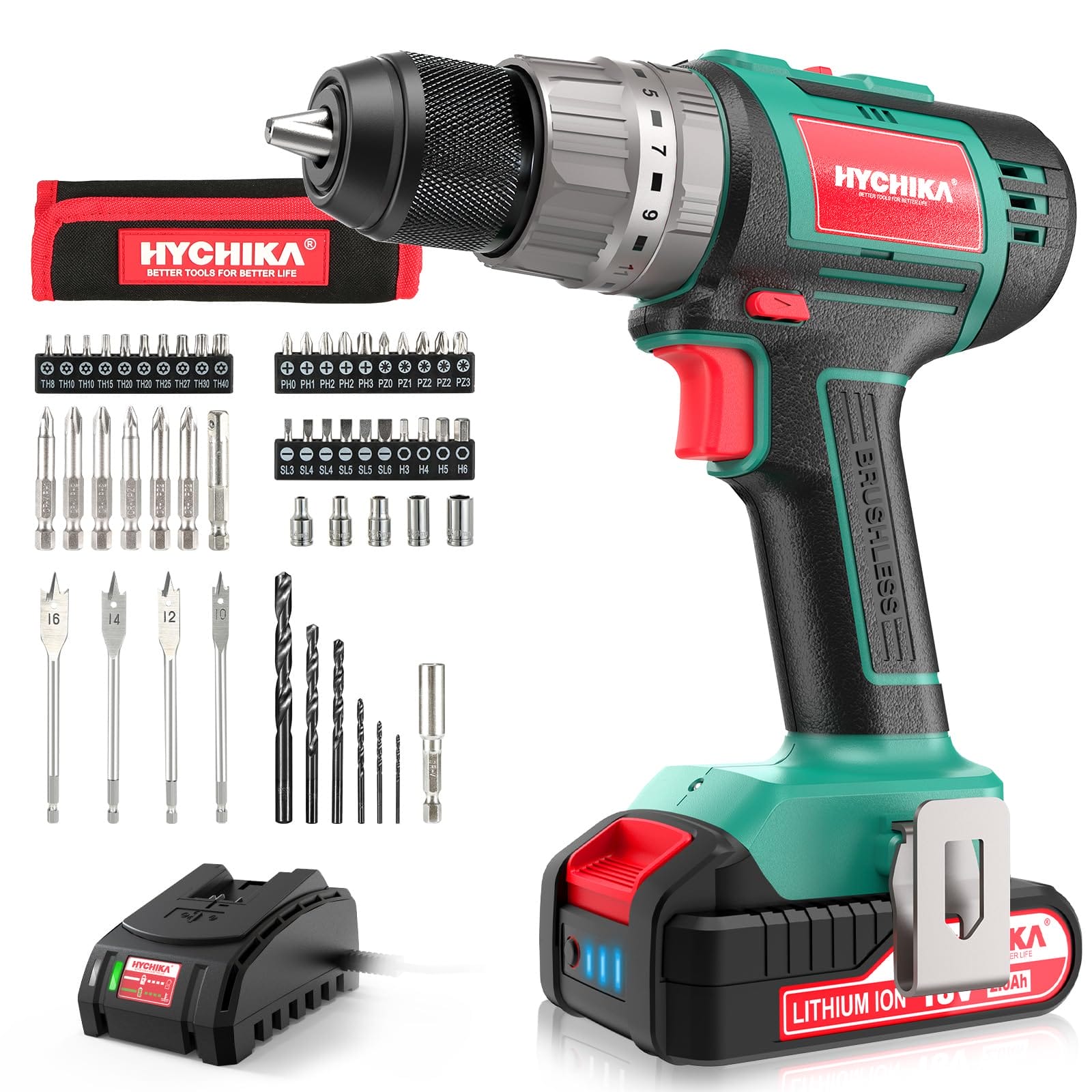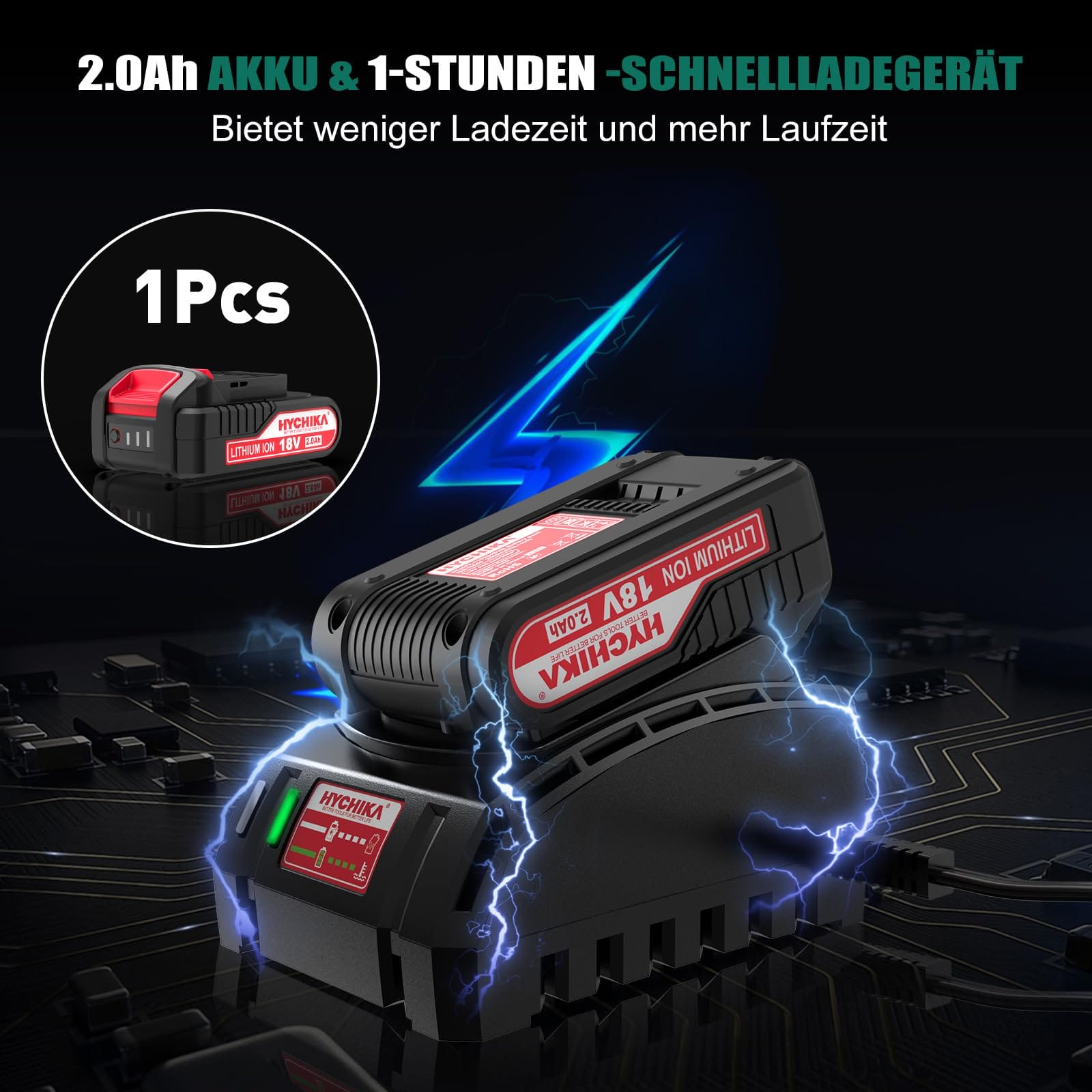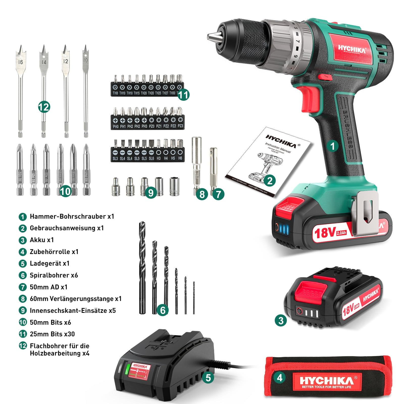 ‎1 x akumulatorowa wiertarko-wkrętarka udarowa HYCHIKA 18 V, ️53 akcesoria, 2 x akumulator litowo-jonowy 2 Ah, 1 x ładowarka do szybkiego ładowania, 1 x klips do paska, 1 x wytrzymałe pudełko na narzę