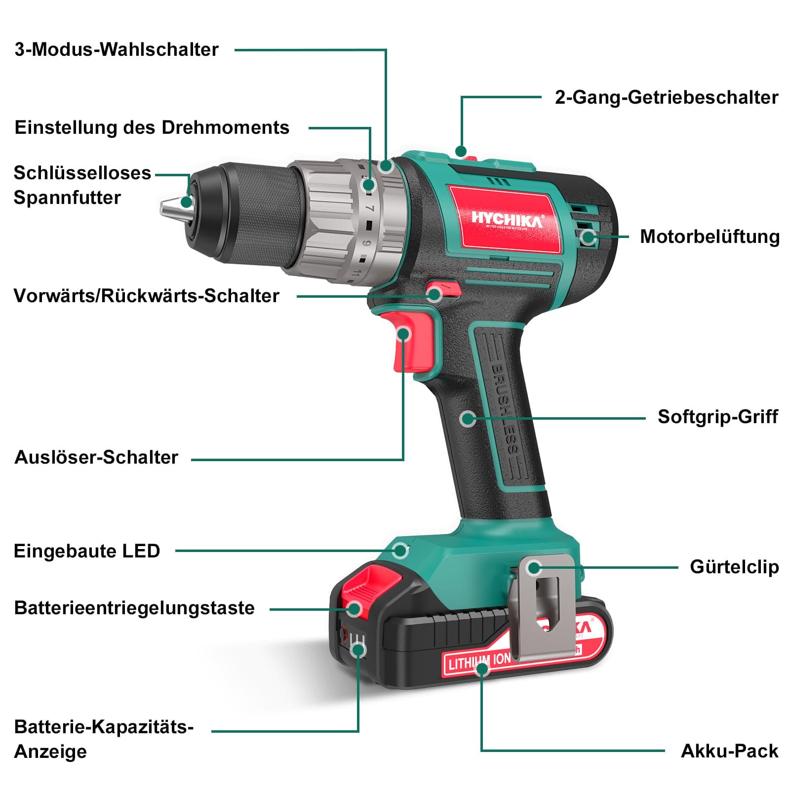 3 tryby i: 3 tryby i 2 biegi – wydajna wkrętarka udarowa jest wyposażona w 3 tryby pracy i w pełni metalową przekładnię do wiercenia, wkręcania i wiercenia udarowego. Do mocnego wkręcania i szybkiego wiercenia HYCHIKA wkrętarka akumulatorowa jest uniwersalna dzięki 2-biegowej przekładni (prędkość 0-400 obr./mi