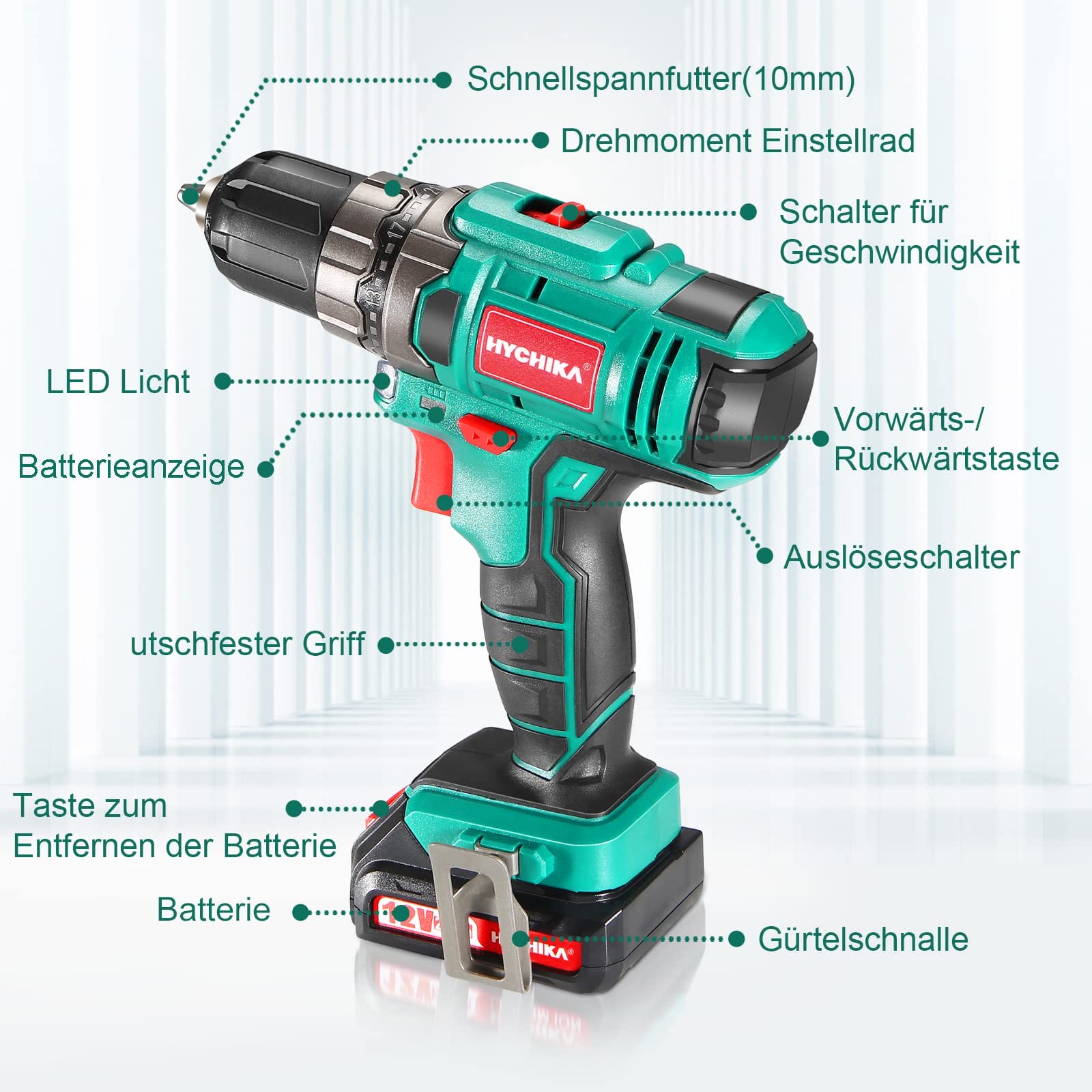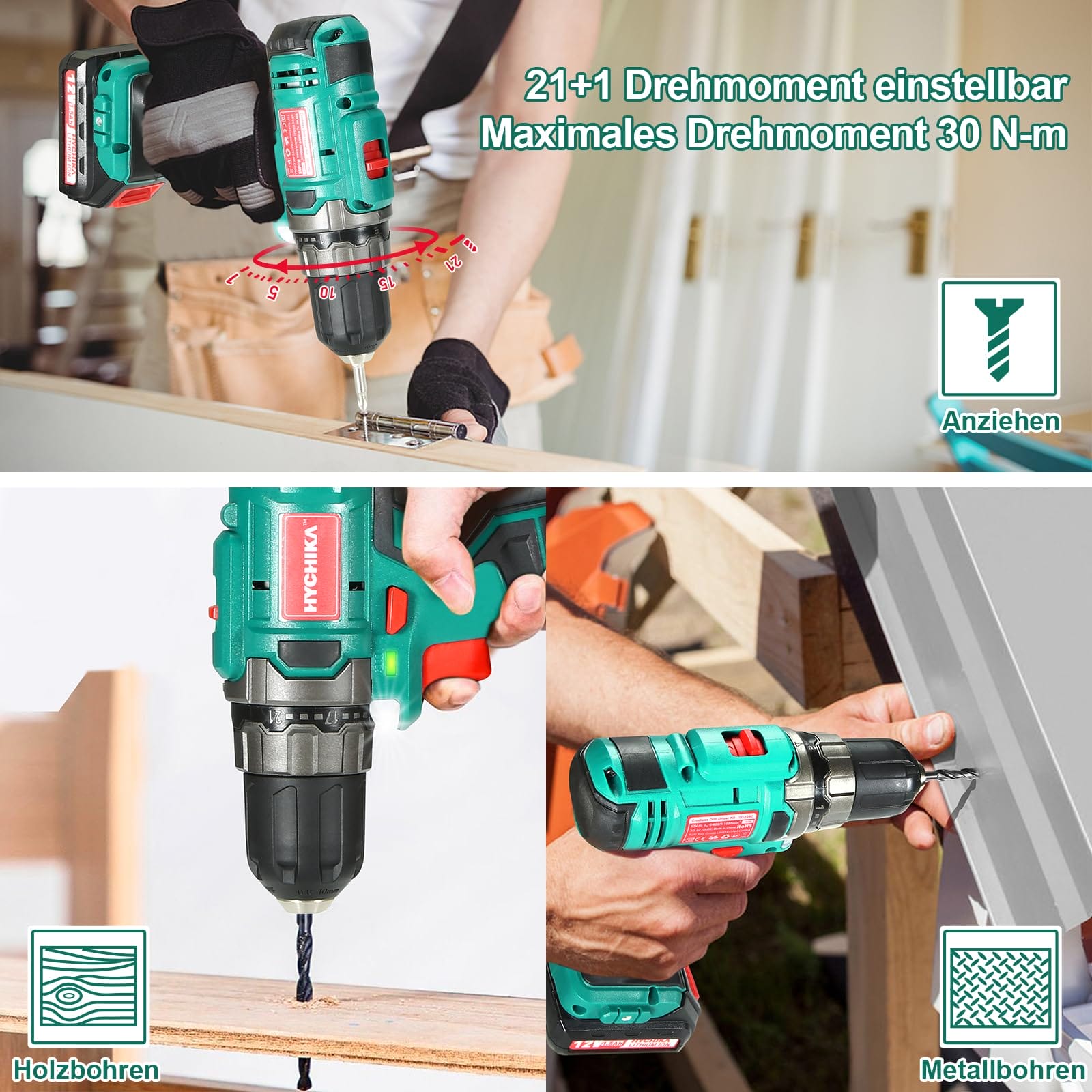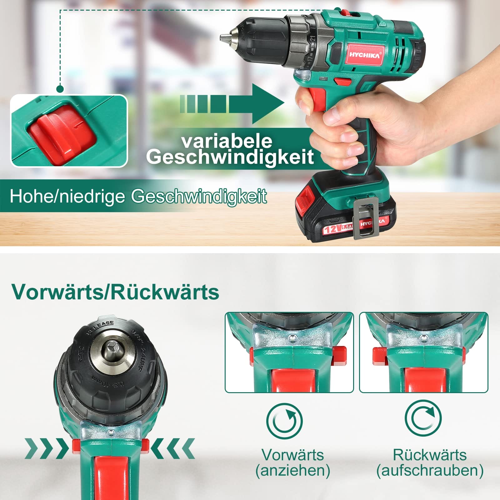 Wiertarka Akumulatorowa 12V, Hychika Wiertarka Elektryczna 30N-M Max Moment Obrotowy Z Akumulatorem 1500Mah, 21+1 regulacji prędkości, 2 regulacje prę