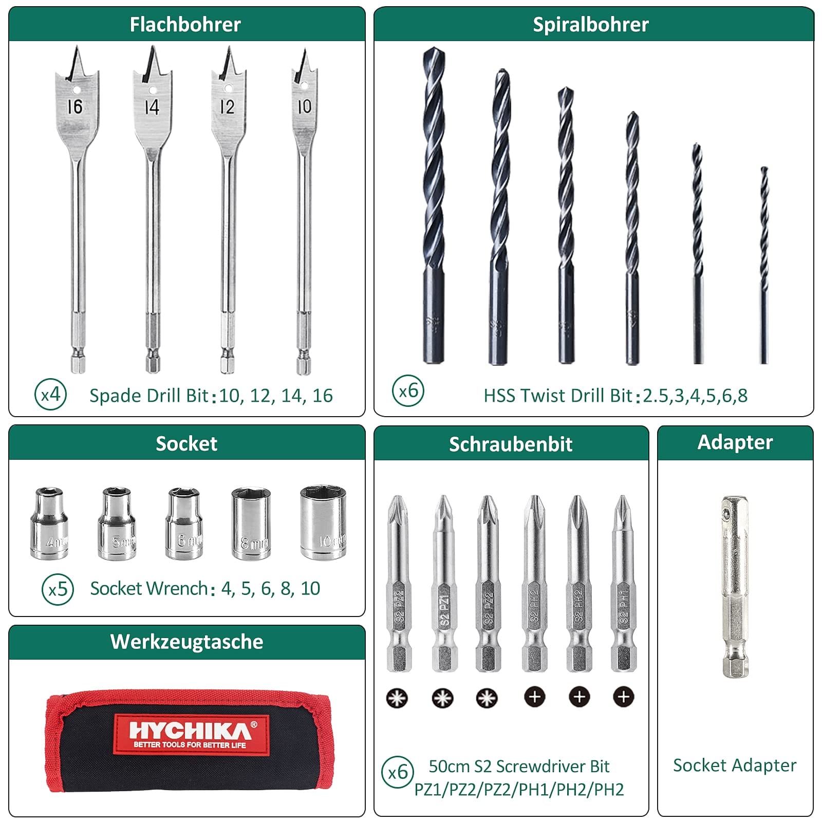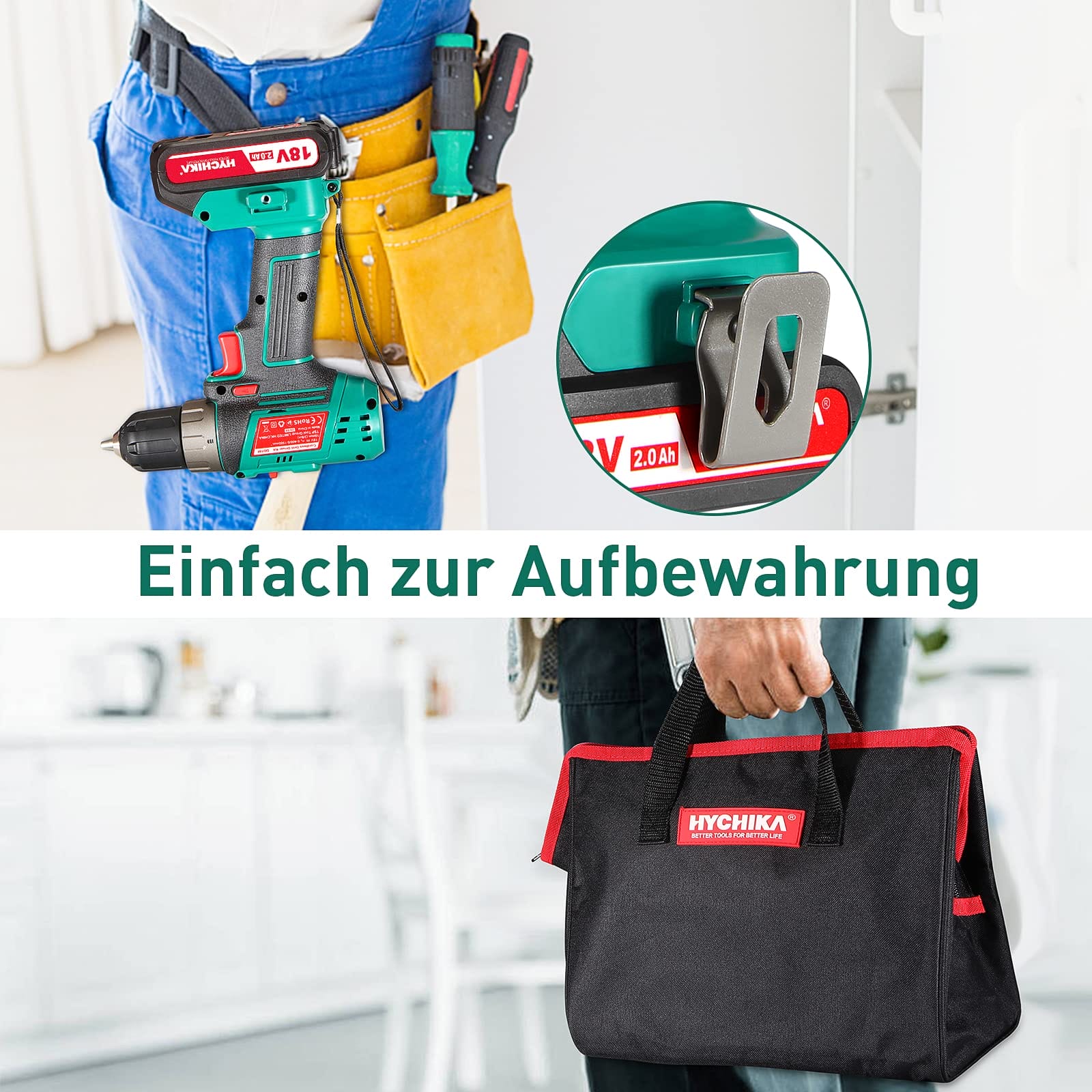 Otrzymujesz kompletny zestaw, który obejmuje: 1 x akumulatorową wiertarko-wkrętarkę 18V Hychika, 22 x akcesoria, 1 x akumulator litowy 18V 2000mAh, 1 x szybką ładowarkę, 1 x klamrę do paska, 1 x portfel na narzędzia, 1 x torbę transportową i 1 x instrukcję obsługi.
