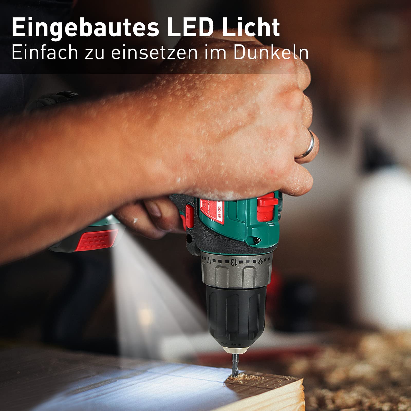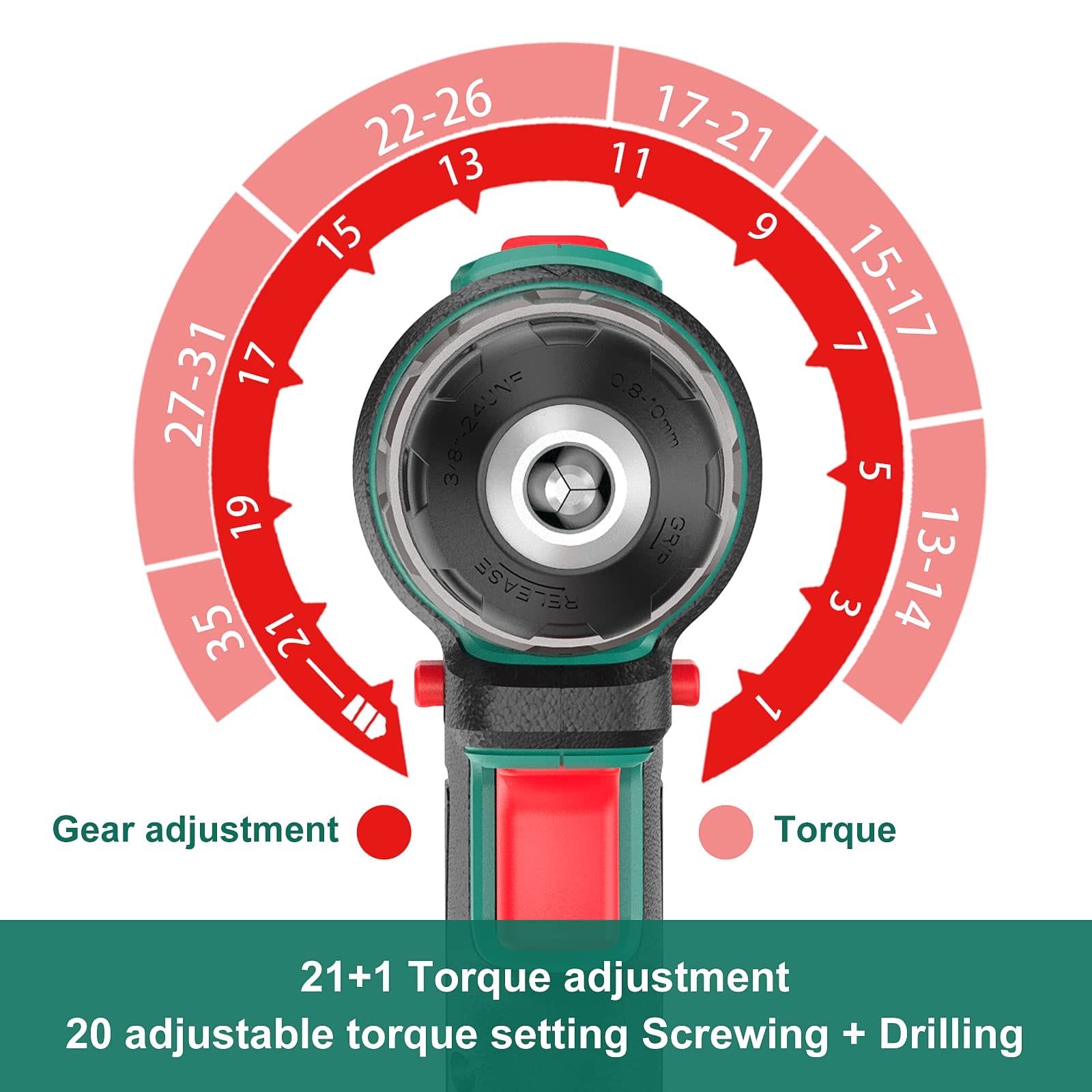Narzędzie posiada 21 + 1 ustawień momentu obrotowego, co umożliwia dostosowanie siły wiercenia do różnych materiałów, takich jak drewno, metal i plastik. Maksymalny moment obrotowy wynosi 35 N-m, co zapewnia wystarczającą siłę do wkręcania śrub.