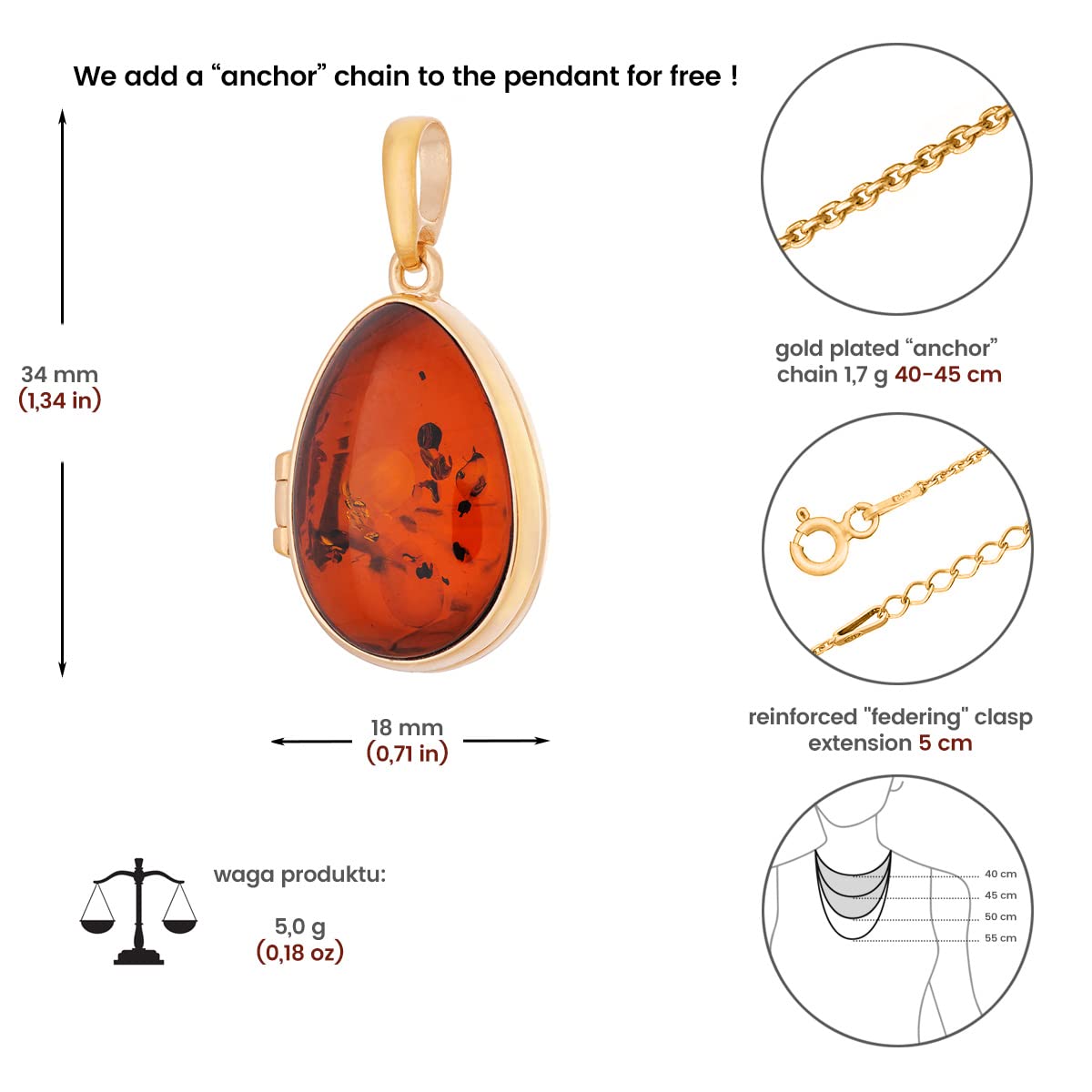 Owalny medalion tajny ze swobodnym łańcuszkiem sprawia, że zawieszka jest nie tylko pięknym elementem biżuterii, ale także praktycznym dodatkiem, który można nosić na co dzień lub na specjalne okazje. Bursztynowy kolor dodaje delikatności i elegancji, podkreślając naturalne piękno każdej kobiety.