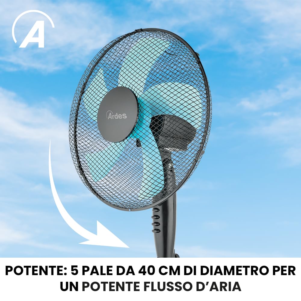 **1. Wydajność i efektywność:** Wentylator wyposażony jest w 5 łopatek o średnicy 40 cm, co zapewnia optymalny przepływ powietrza i skuteczne chłodzenie nawet w większych pomieszczeniach. Dzięki oscylacyjnej funkcji, wentylator rozprowadza chłodne powietrze równomiernie, eliminując strefy gorąca.