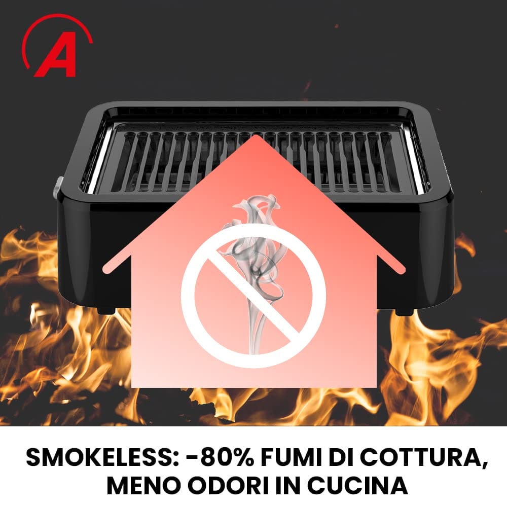 Grill jest wyposażony w technologię bezdymną, co oznacza, że można go używać w zamkniętych pomieszczeniach bez obawy o zanieczyszczenie powietrza dymem. Dzięki temu można go swobodnie używać w kuchni lub na balkonie bez ryzyka zadymienia.