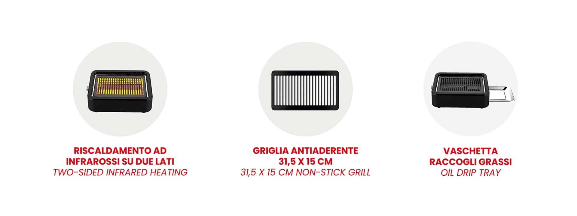 Wymiary grilla to 41 cm długości, 27 cm szerokości i 12,5 cm wysokości. Grill jest wyposażony w duży, wymienny grill o wymiarach 31,5 x 15 cm. Moc grilla wynosi 1100/1300 W.