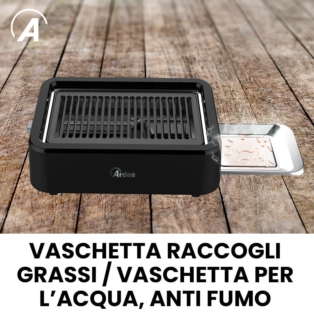 Grill ARDES | ARGRILL01 ma moc 1100 W, co zapewnia optymalne nagrzewanie i równomierne grillowanie potraw. Jest wyposażony w specjalną misę na wodę, która zapobiega powstawaniu dymu i zapewnia zdrowsze gotowanie.