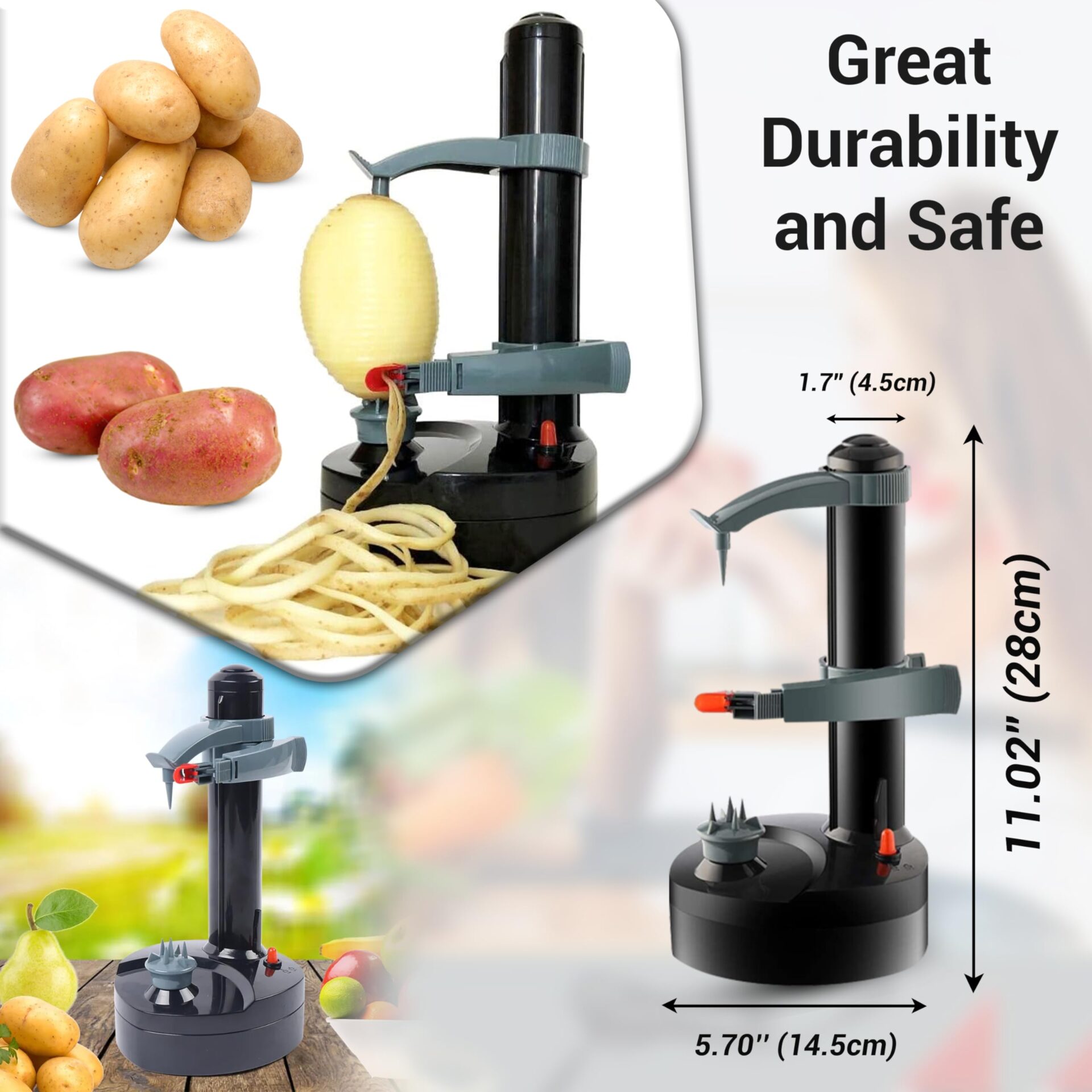 ✅ Elektryczna obieraczka do: Elektryczna obieraczka do ziemniaków – wytrzymałe tworzywo sztuczne ABS i antypoślizgowa podstawa. Wymiary opakowania to 29 x 15,3 x 15,2 cm, a waga to 720 g. Może obrać ziemniaki, słodkie ziemniaki, pomidory, cukinię, jabłka, gruszki, pomarańcze, cytryny, persymonę, mango, kiwi, ogórek, rzodkiewkę,