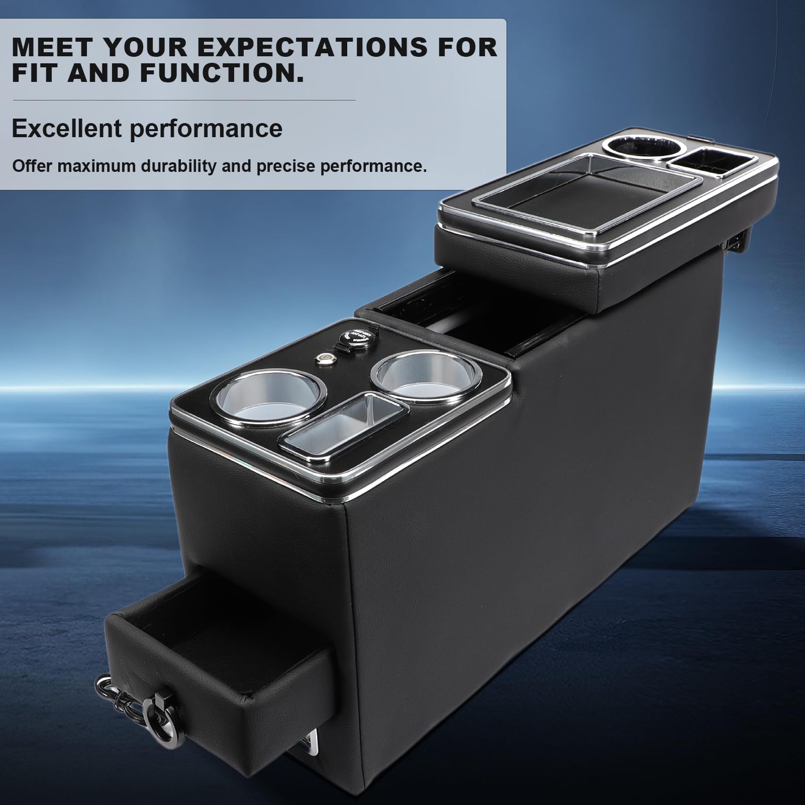 Półki i schowki zapewniają wygodne przechowywanie drobnych przedmiotów, takich jak klucze, telefon czy dokumenty. Dzięki czarnemu wykończeniu konsola doskonale komponuje się z wnętrzem większości samochodów, dodając im elegancji i nowoczesności.