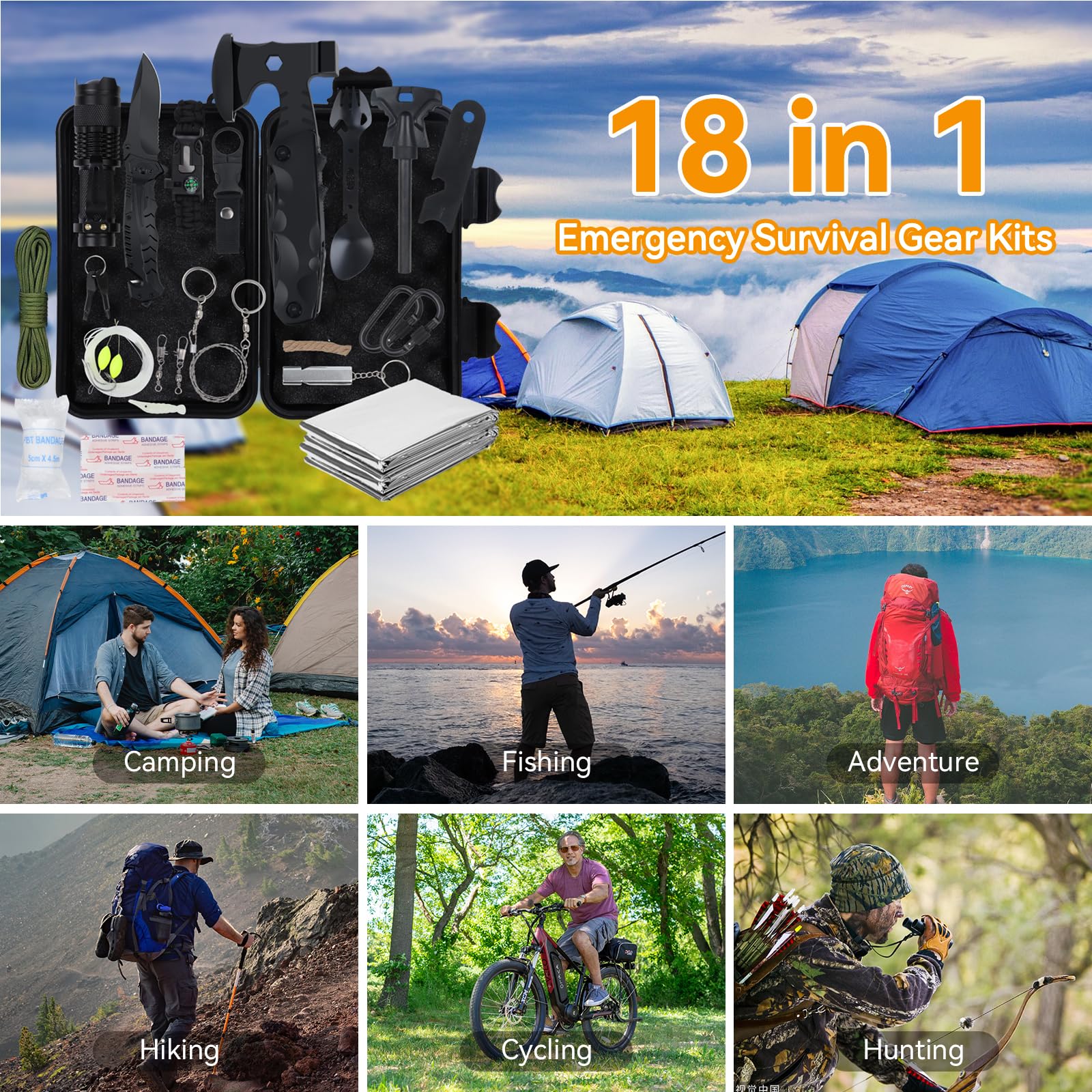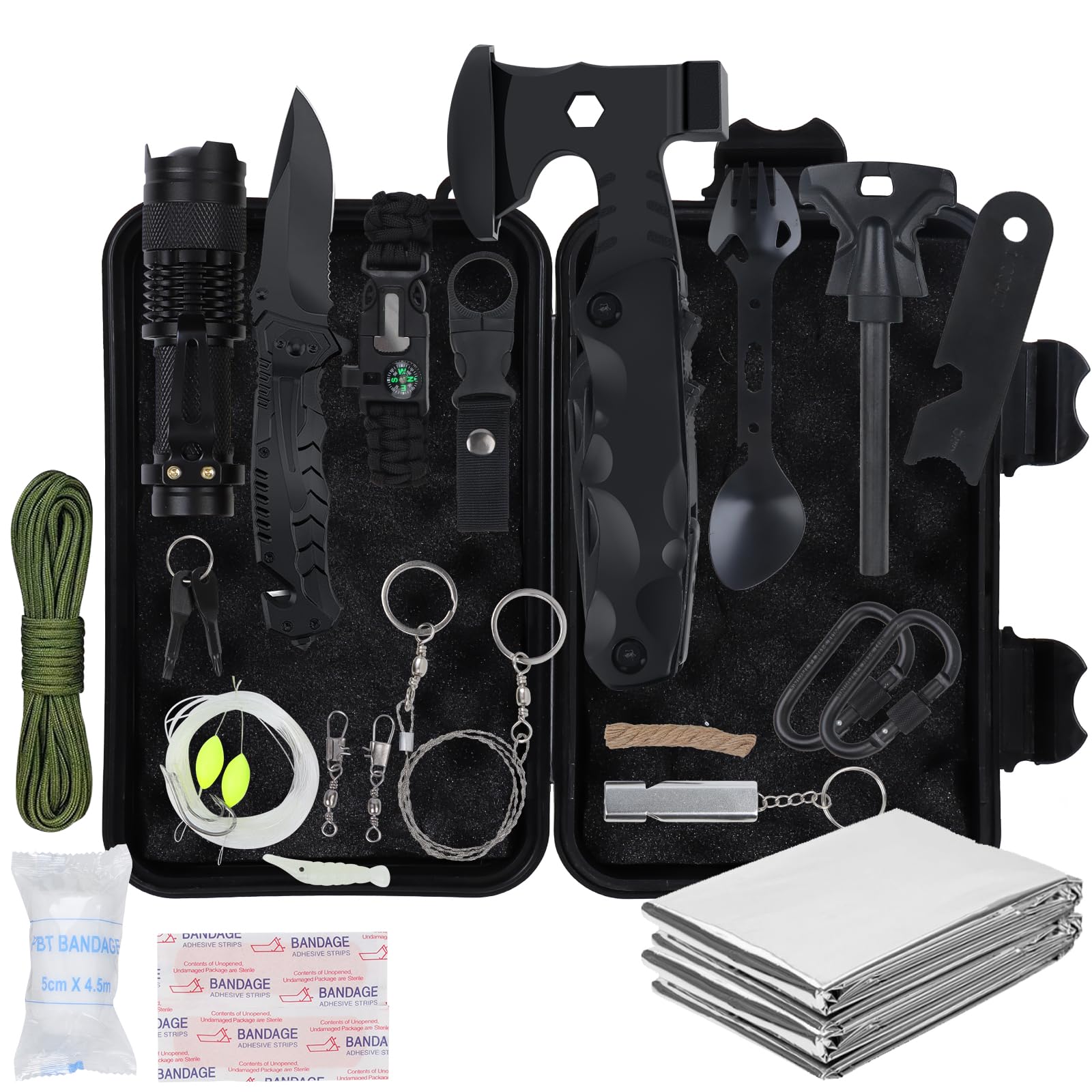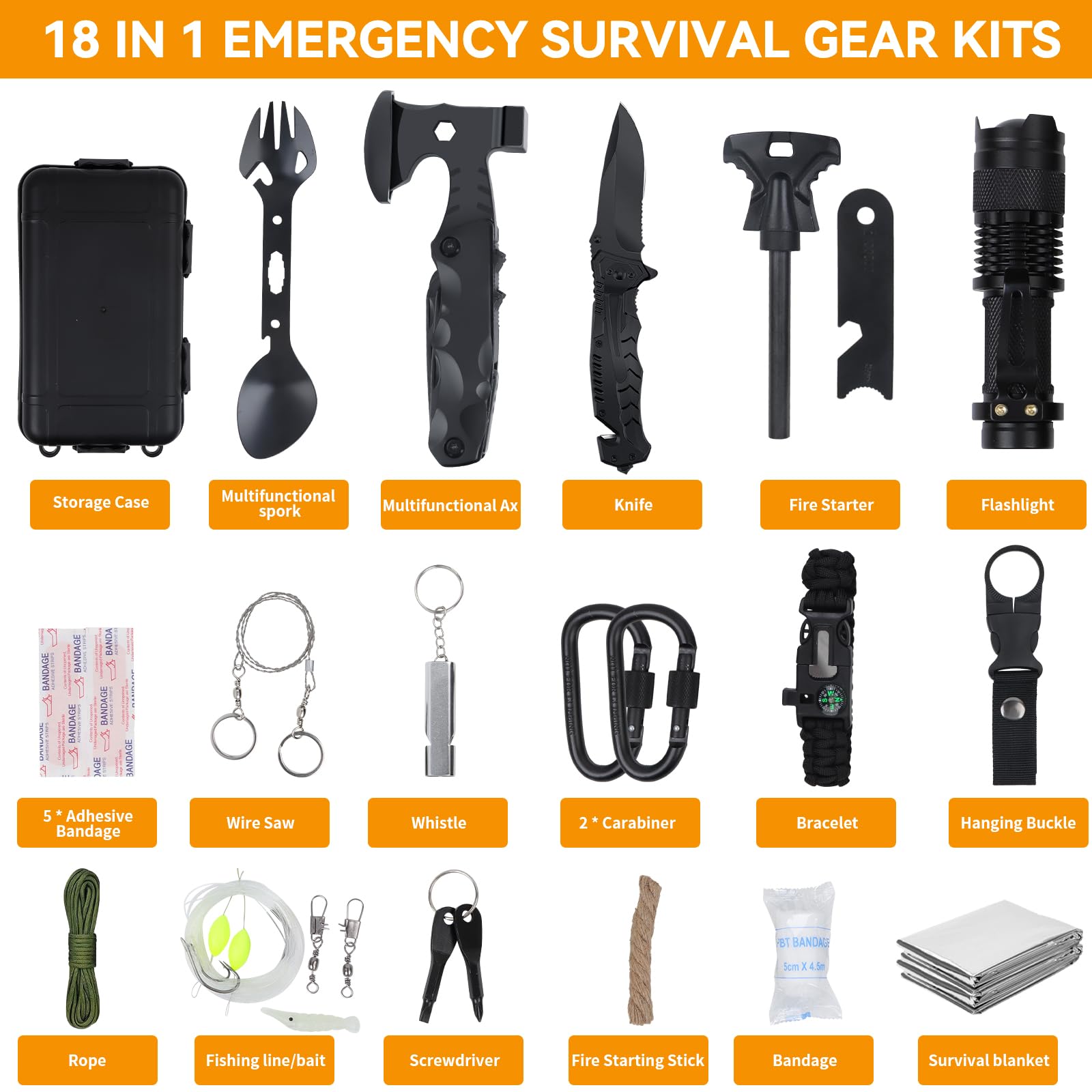 ✅ 🏕️【Zestaw survivalowy 18-w-1: 🏕️【Zestaw survivalowy 18-w-1 na wypadek awarii】Zawiera 18 ważnych przyborów do przygód na świeżym powietrzu, takich jak Zestaw zawiera: ulepszony nóż składany, latarkę wielofunkcyjną, zestaw żelazka, piłę drucianą, bransoletkę z linki paracord, klips na butelkę z wodą, łyżkę wielofunkcyjną oraz koc