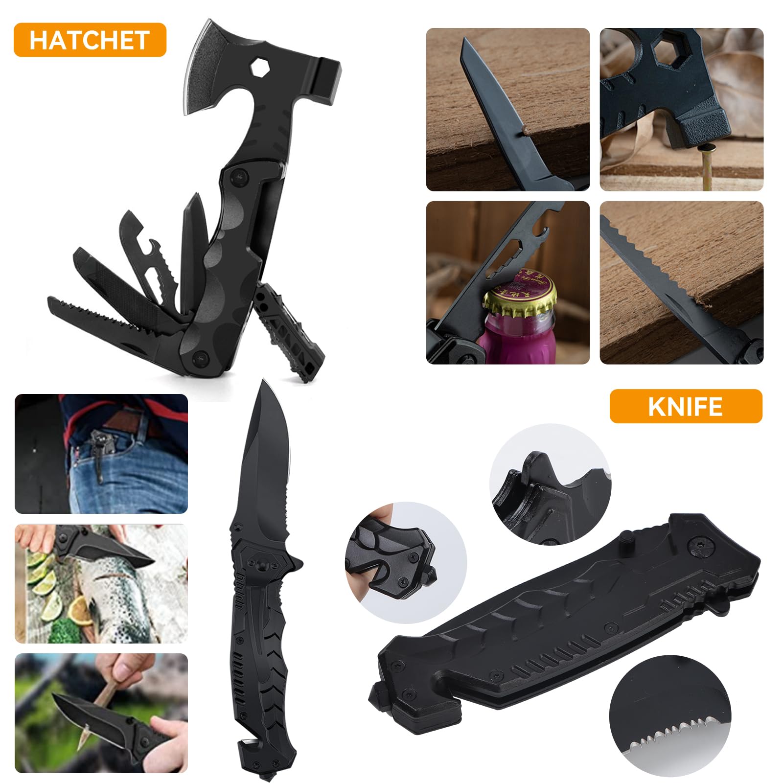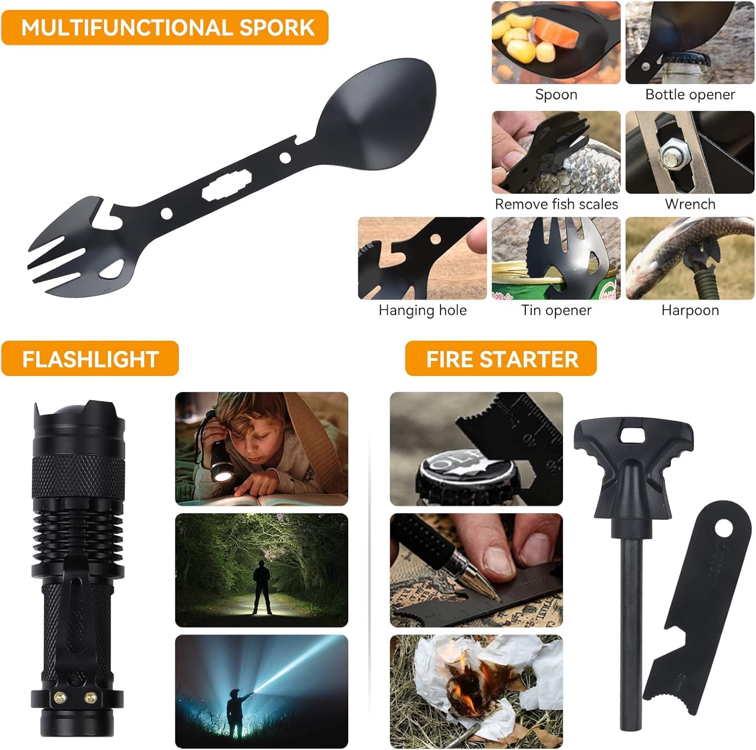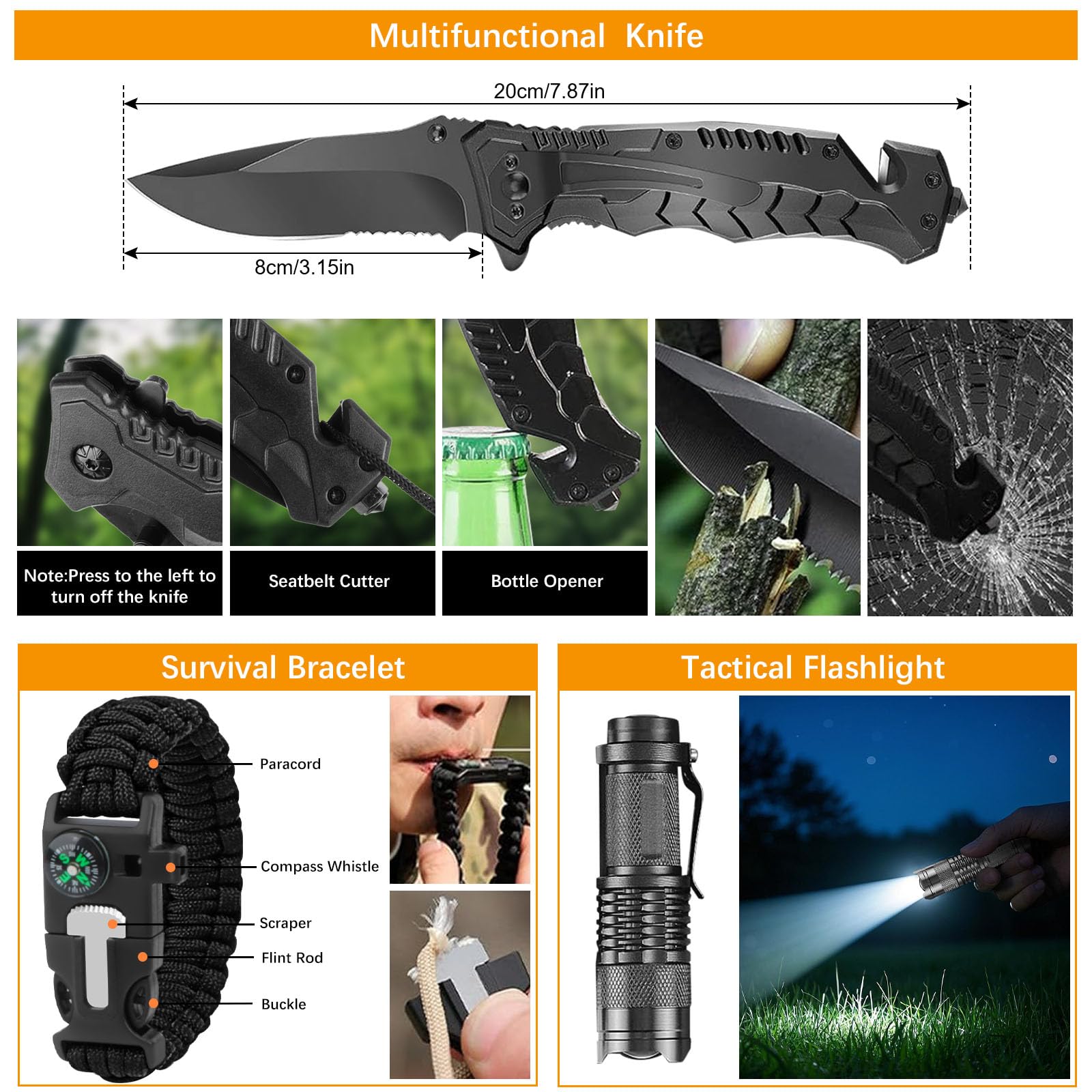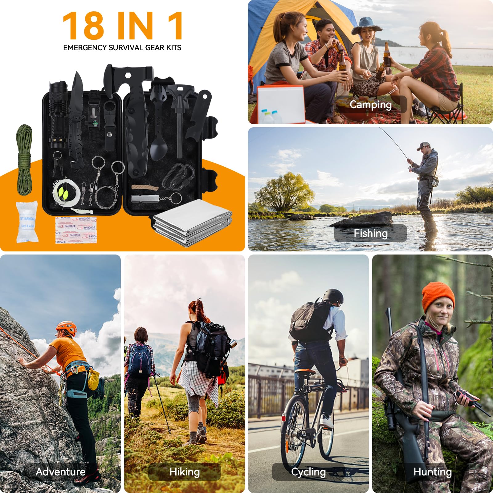 ✅ 🏕️【Zestaw survivalowy 18-w-1: 🏕️【Zestaw survivalowy 18-w-1 na wypadek awarii】Zawiera 18 ważnych przyborów do przygód na świeżym powietrzu, takich jak Zestaw zawiera: ulepszony nóż składany, latarkę wielofunkcyjną, zestaw żelazka, piłę drucianą, bransoletkę z linki paracord, klips na butelkę z wodą, łyżkę wielofunkcyjną oraz koc