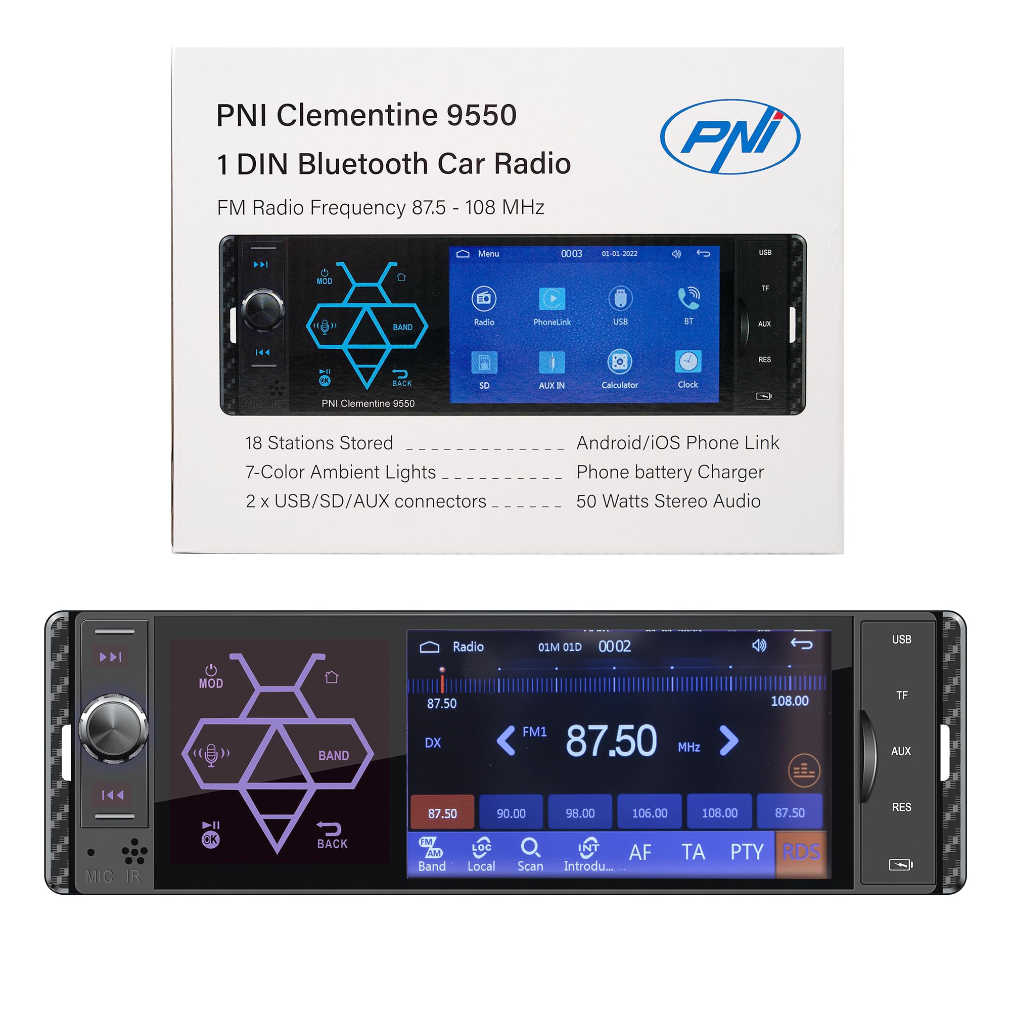 Radio FM z funkcją RDS zapewnia doskonałą jakość odbioru sygnału radiowego, a moc 50Wx4 gwarantuje potężny dźwięk w samochodzie. Ponadto, odtwarzacz MP5 PNI Clementine 9550 posiada wiele wejść i wyjść, co umożliwia podłączenie różnych urządzeń audio i wideo.