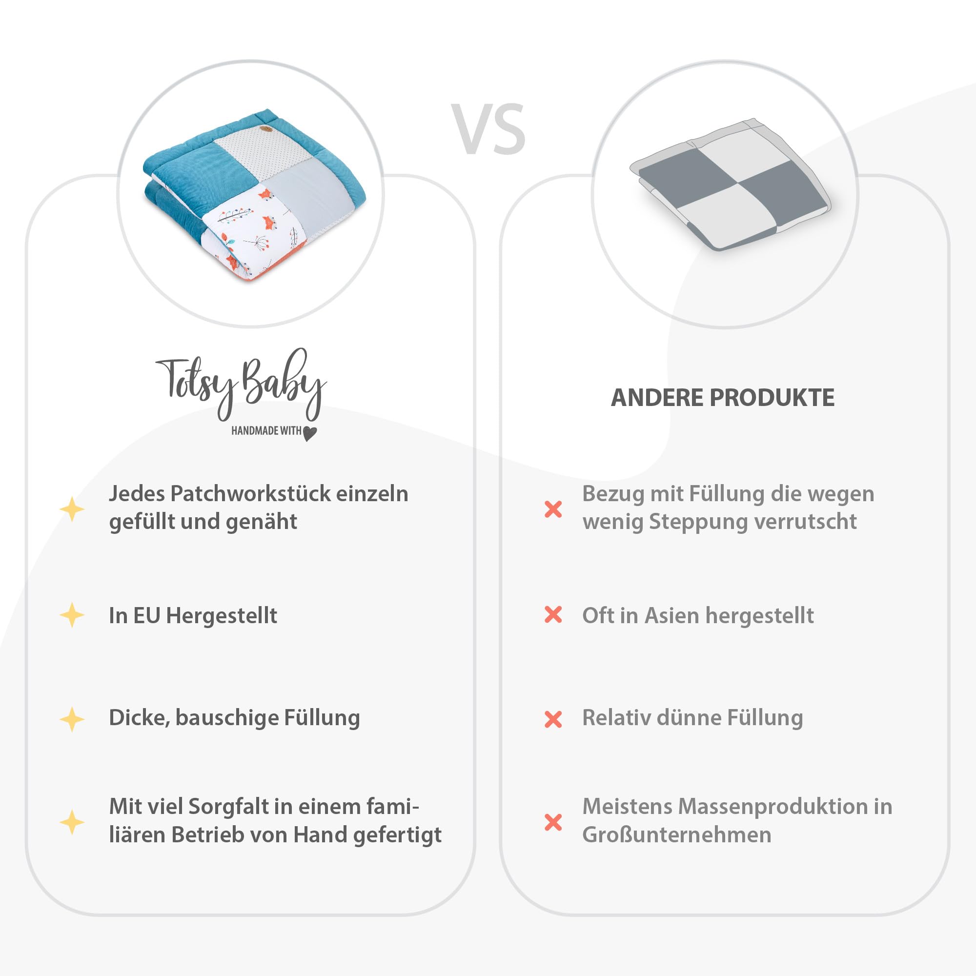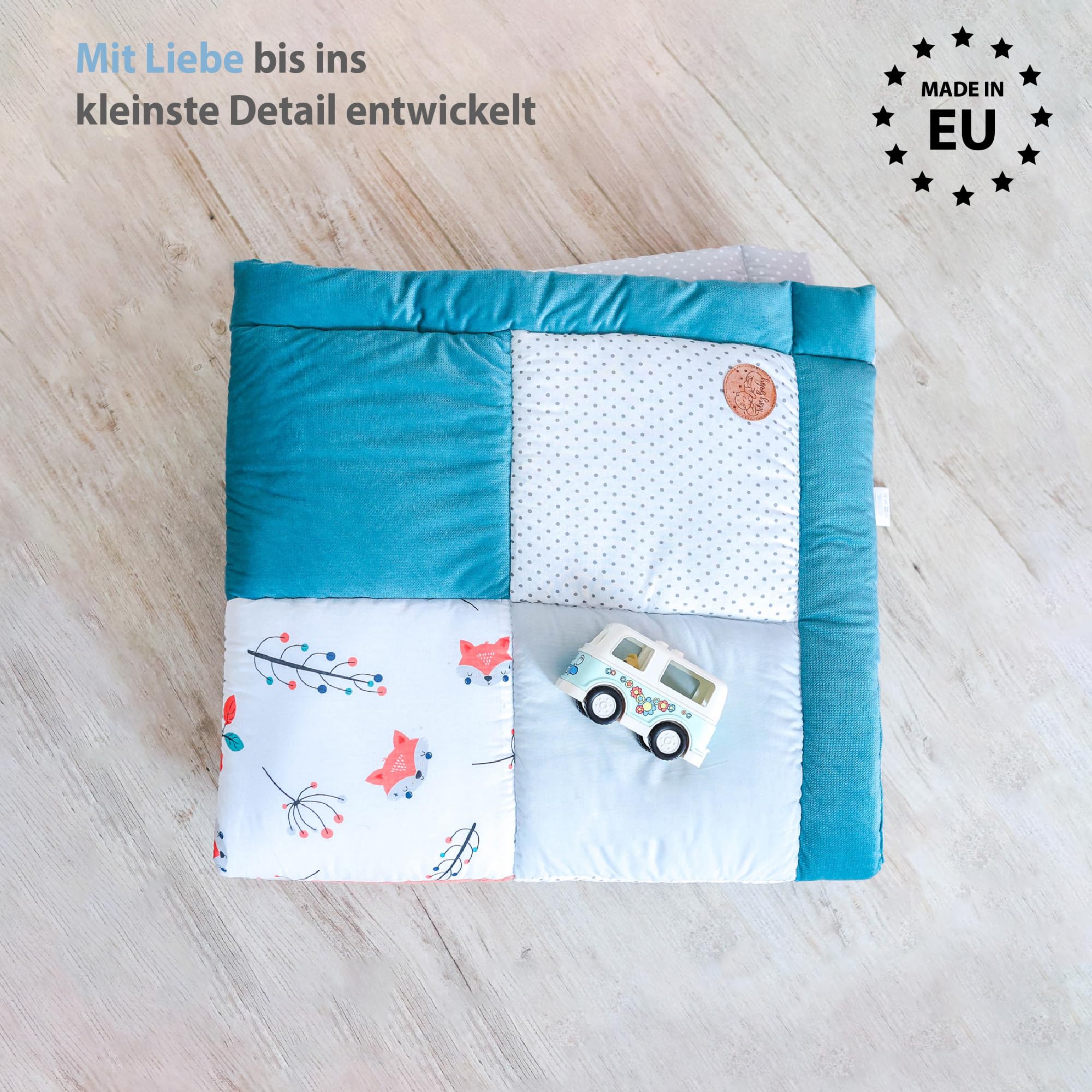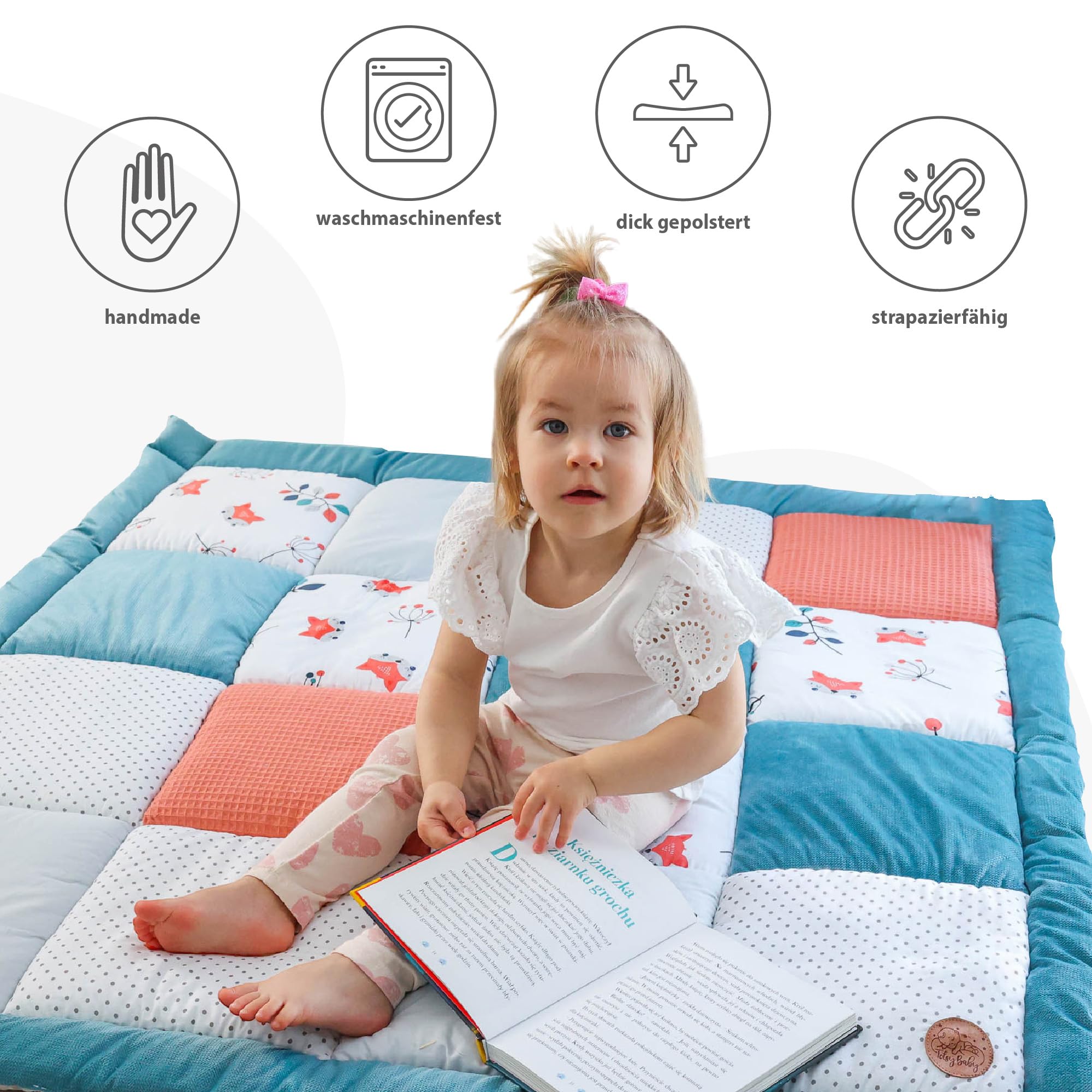 Wygodna wyściółka –: Wygodna wyściółka – ok. Wypełnienie maty do zabawy dla niemowląt o grubości 4 cm chroni przed zimnym i twardym podłożem i zapewnia miękkie trzymanie podczas pierwszych prób raczkowania. Koc zabawkowy dla dzieci jest nadany do prania w pralce w temperaturze do 30°C. Plamy i zabrudzenia można łatwo us