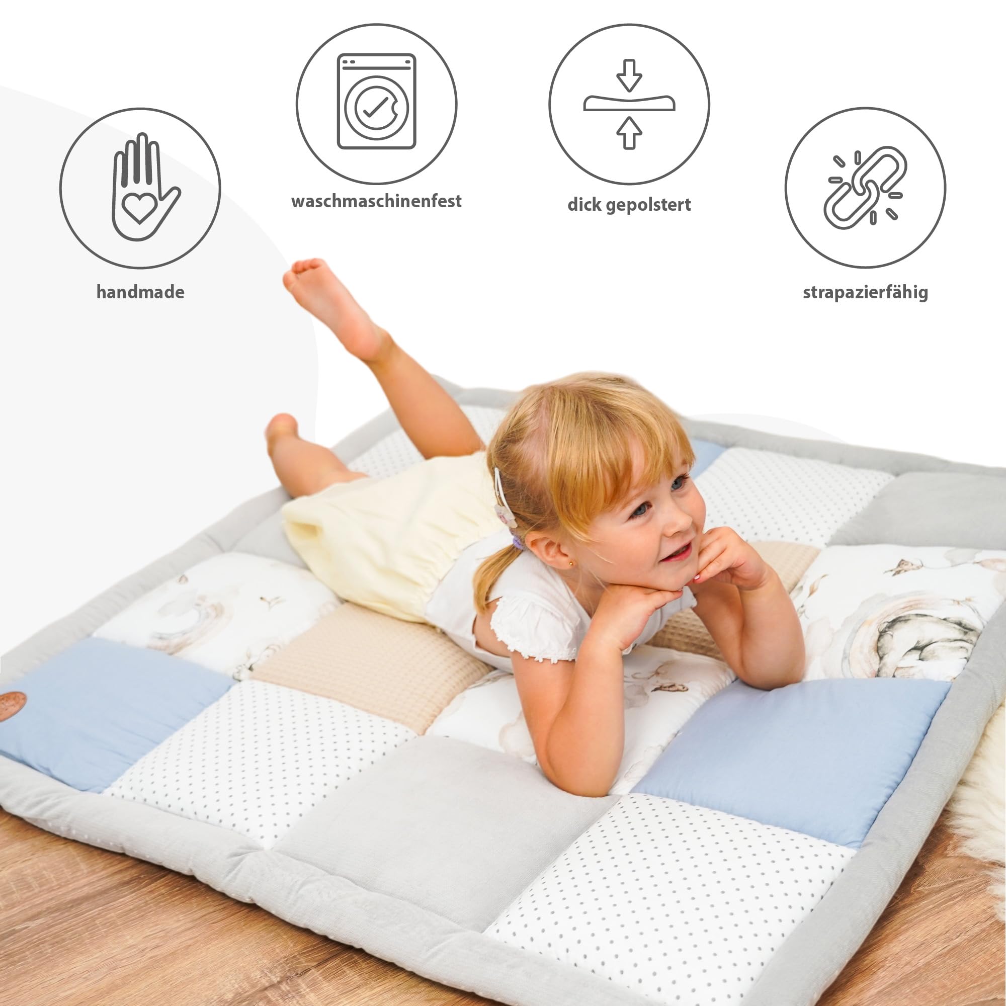 Wygodna wyściółka –: Wygodna wyściółka – ok. Wypełnienie maty do zabawy dla niemowląt o grubości 4 cm chroni przed zimnym i twardym podłożem i zapewnia miękkie trzymanie podczas pierwszych prób raczkowania. Koc zabawkowy dla dzieci jest nadany do prania w pralce w temperaturze do 30°C. Plamy i zabrudzenia można łatwo us