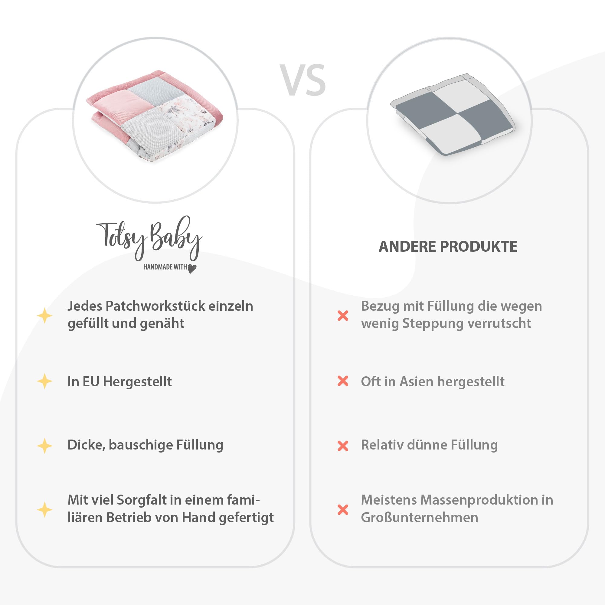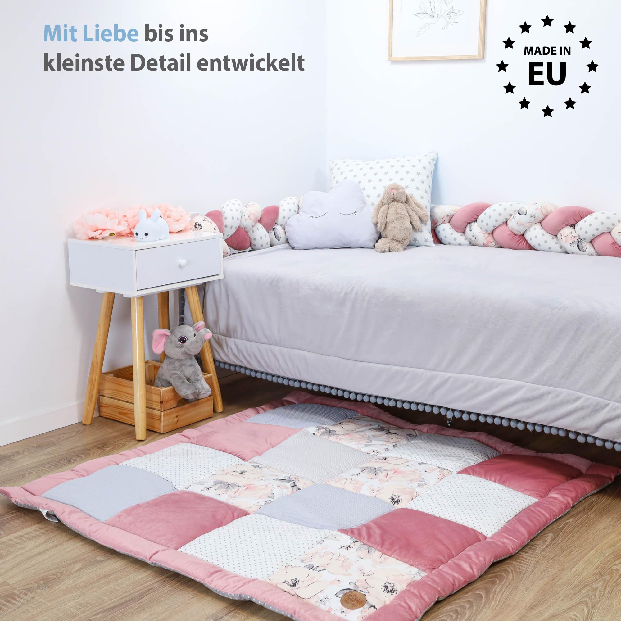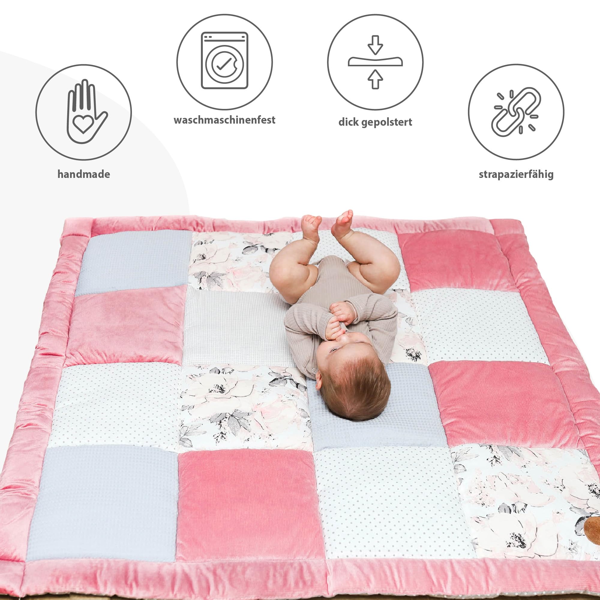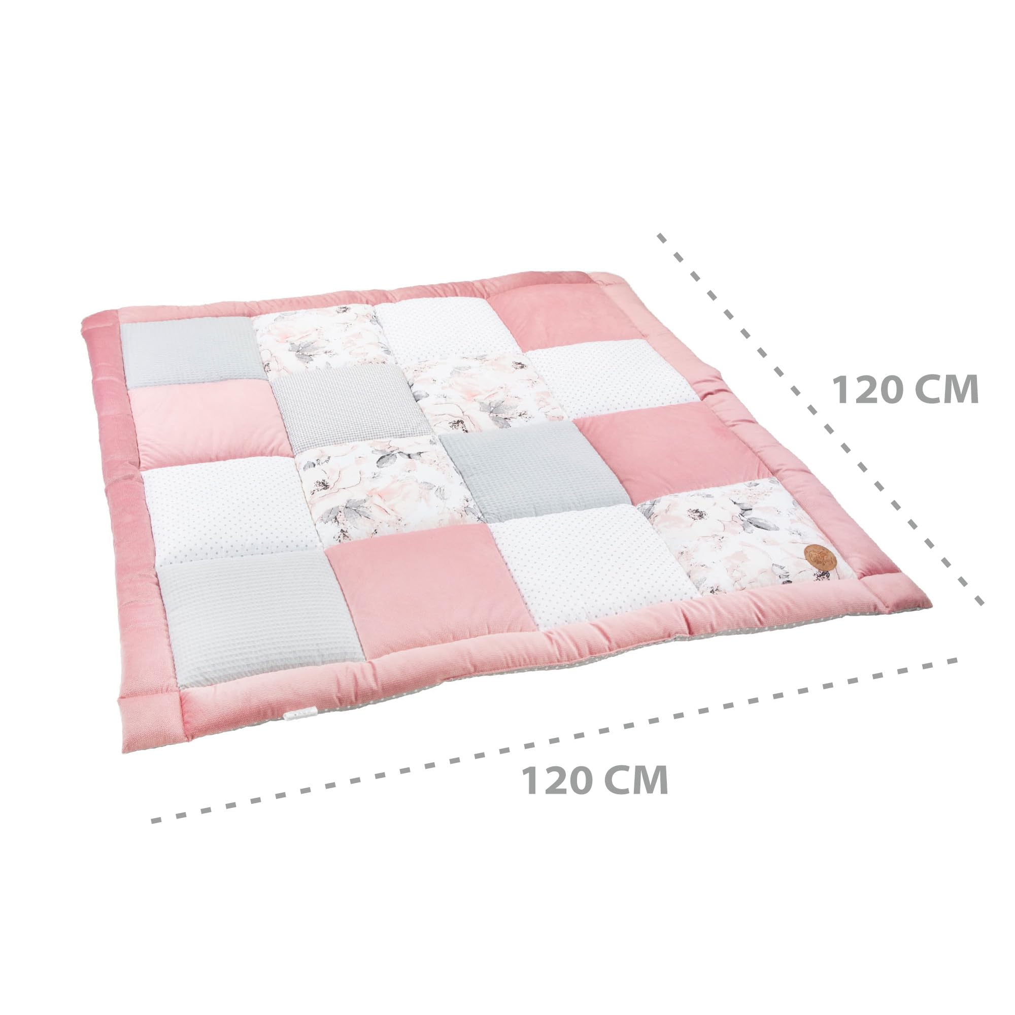 Produkt, którym chcemy się dzisiaj zająć, to Velvet Play Mat for Babies 120×120 cm – PATCHWORK Cotton Insert with Velvet and Waffle Piqué Wild Rose. To nie jest zwykła mata do zabawy dla dzieci, to prawdziwe dzieło sztuki, które łączy w sobie funkcjonalność i estetykę na najwyższym poziomie.