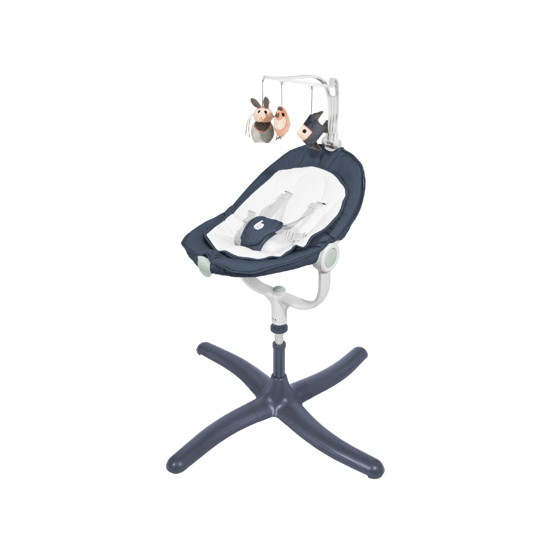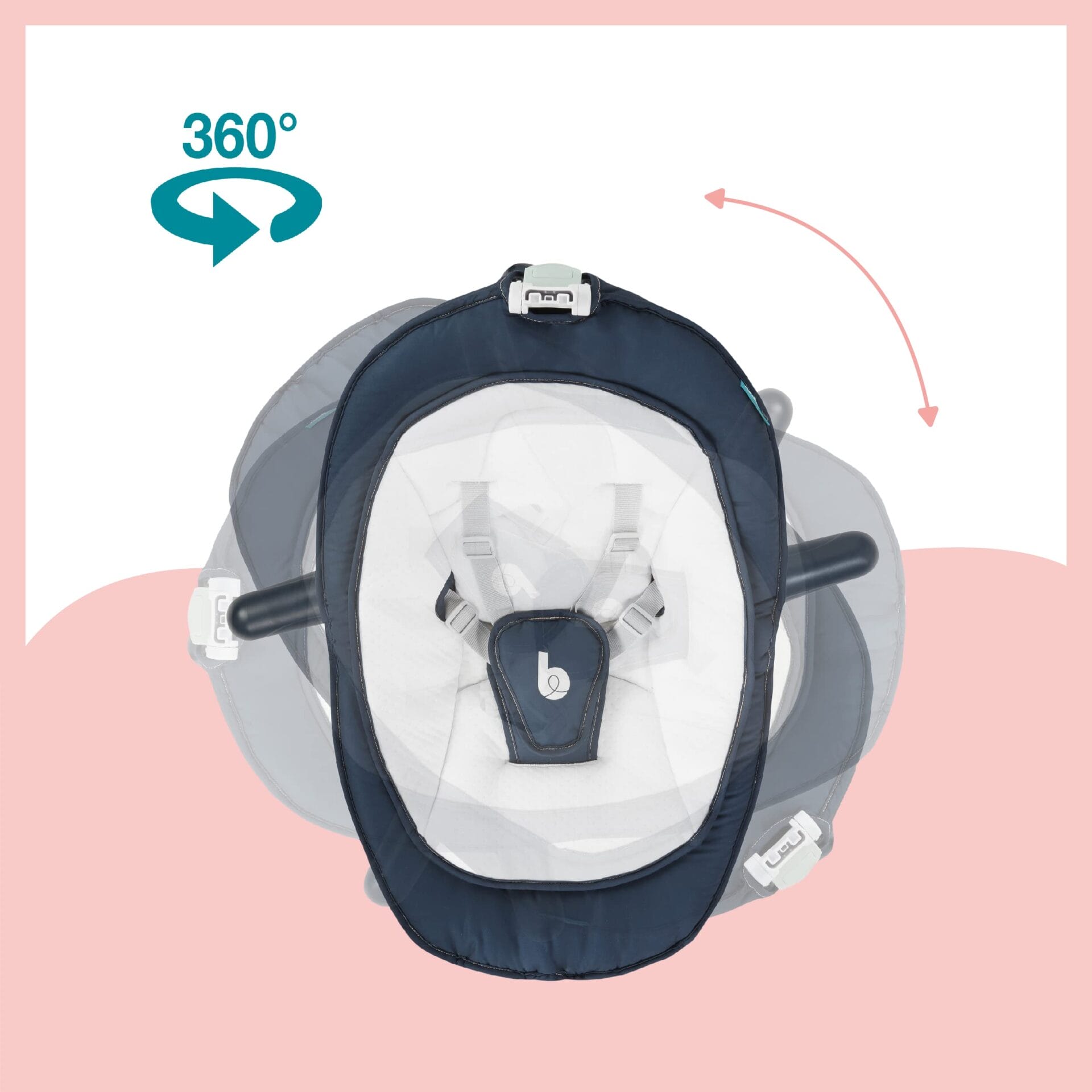 • SYSTEM OBRÓTU: bujaczek ma obrotowe siedzisko 360° z systemem blokady jednej pozycji. Umieść dziecko w samym centrum rodziny bez potrzeby przenoszenia bujaka.