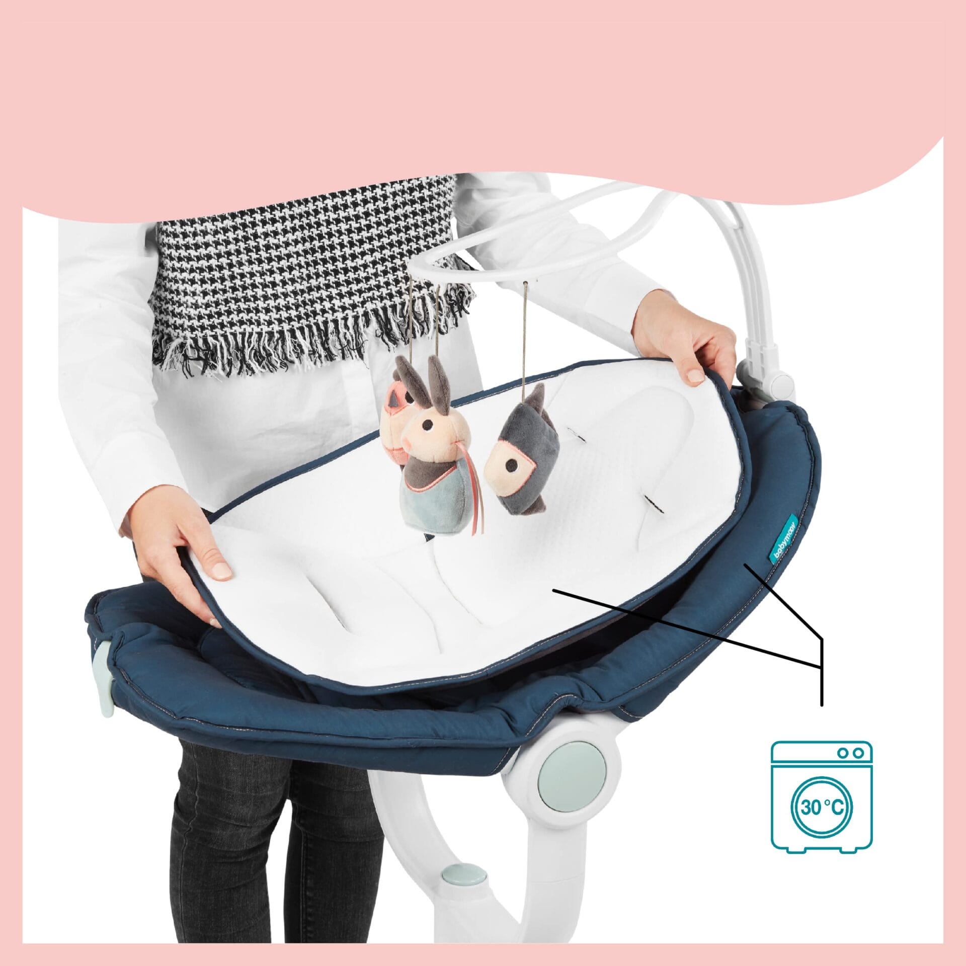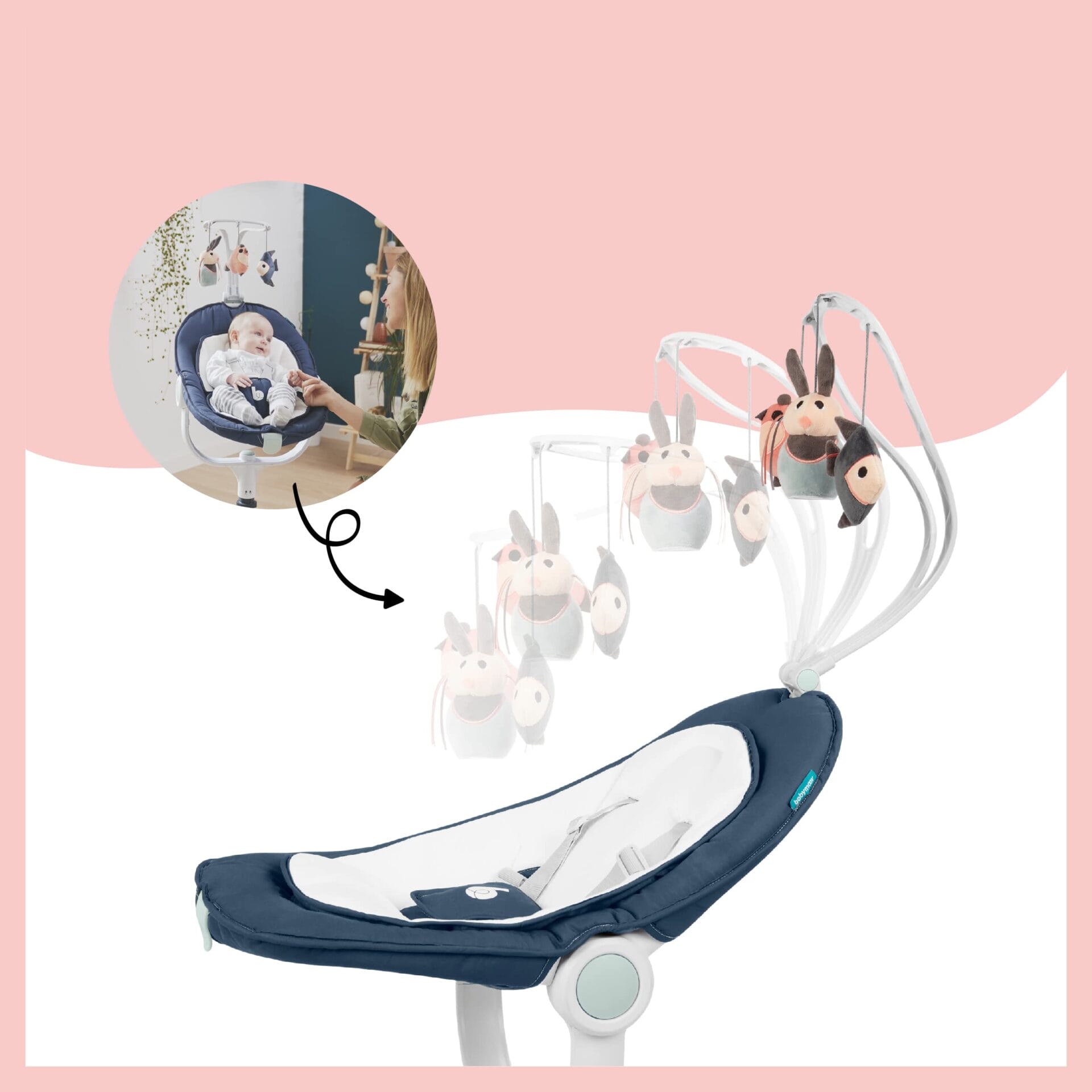 • ZABAWA: dopinany pałąk z 3 zabawkami można regulować w 3 pozycjach, a bujaczek posiada również funkcję naturalnego kołysania, dzięki czemu można zapewnić dziecku rozrywkę.