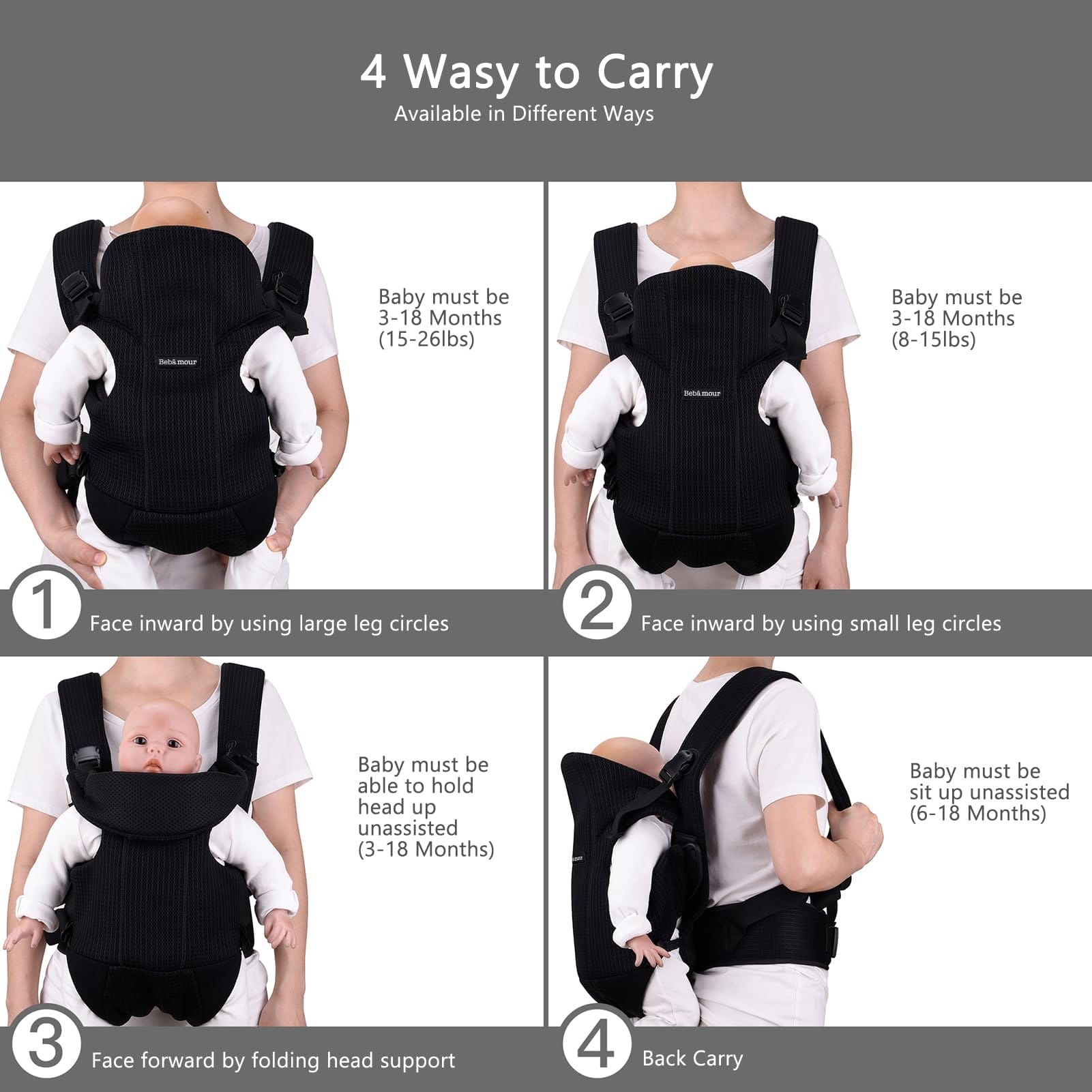 ✅ [Pozycje do noszenia]: [Pozycje do noszenia] Plecak Bebamour dla niemowląt ma rozkładaną konstrukcję skierowaną i skierowaną na zewnątrz dla dziecka w wieku 3-18 miesięcy i które nie przekracza 12 kg.