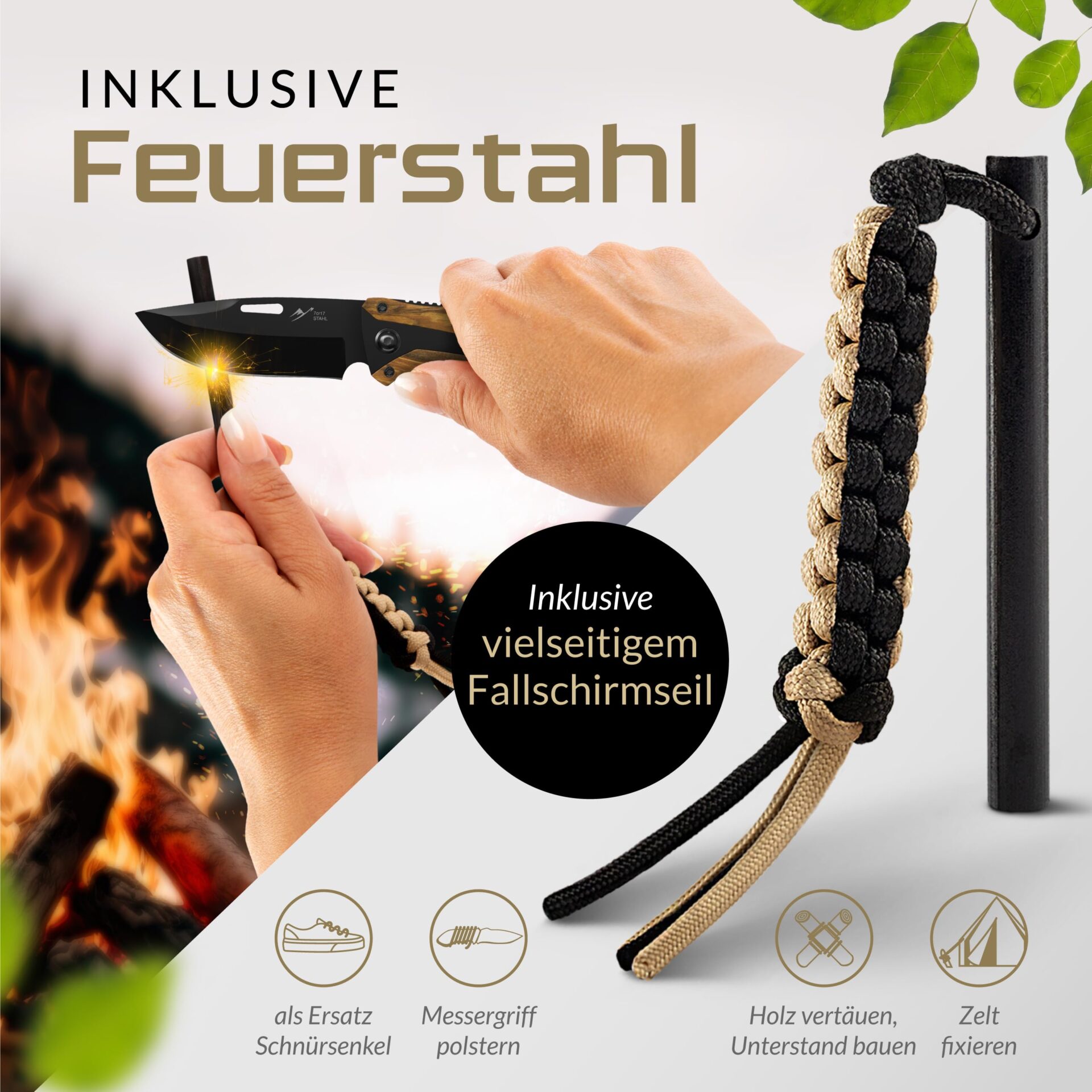 - Dołączone komponenty: Nóż z klipsem do paska, krzesiwo, linka spadochronowa i kabura