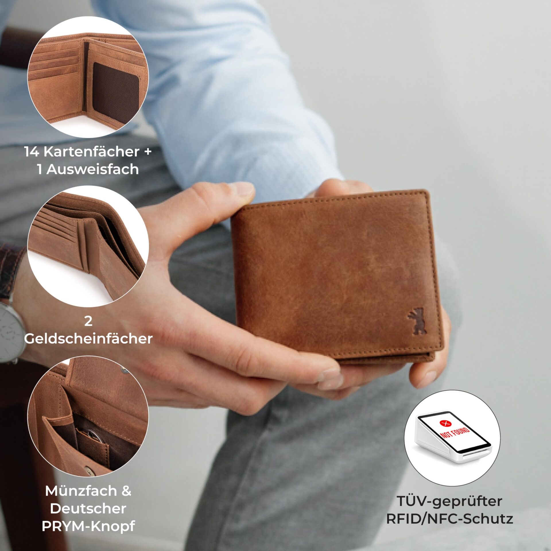 ✅ Twój nowy ulubiony: Twój nowy ulubiony portfel. Ten męski portfel łączy w sobie funkcjonalność i styl: certyfikowana przez TÜV ochrona RFID, niemiecki zatrzask, 8 przegródek na karty, 6 dodatkowych przegródek, 2 przegródki na banknoty, kieszeń na monety z żetonem na zakupy i kieszeń na dowód osobisty.