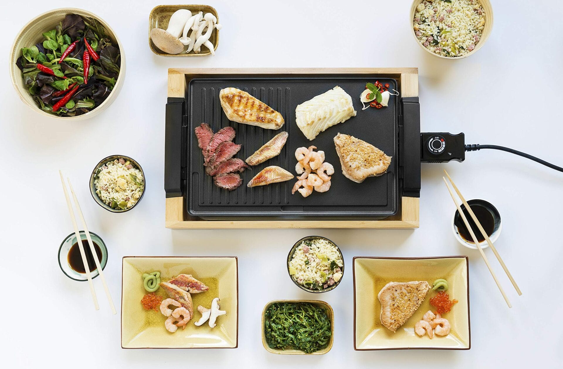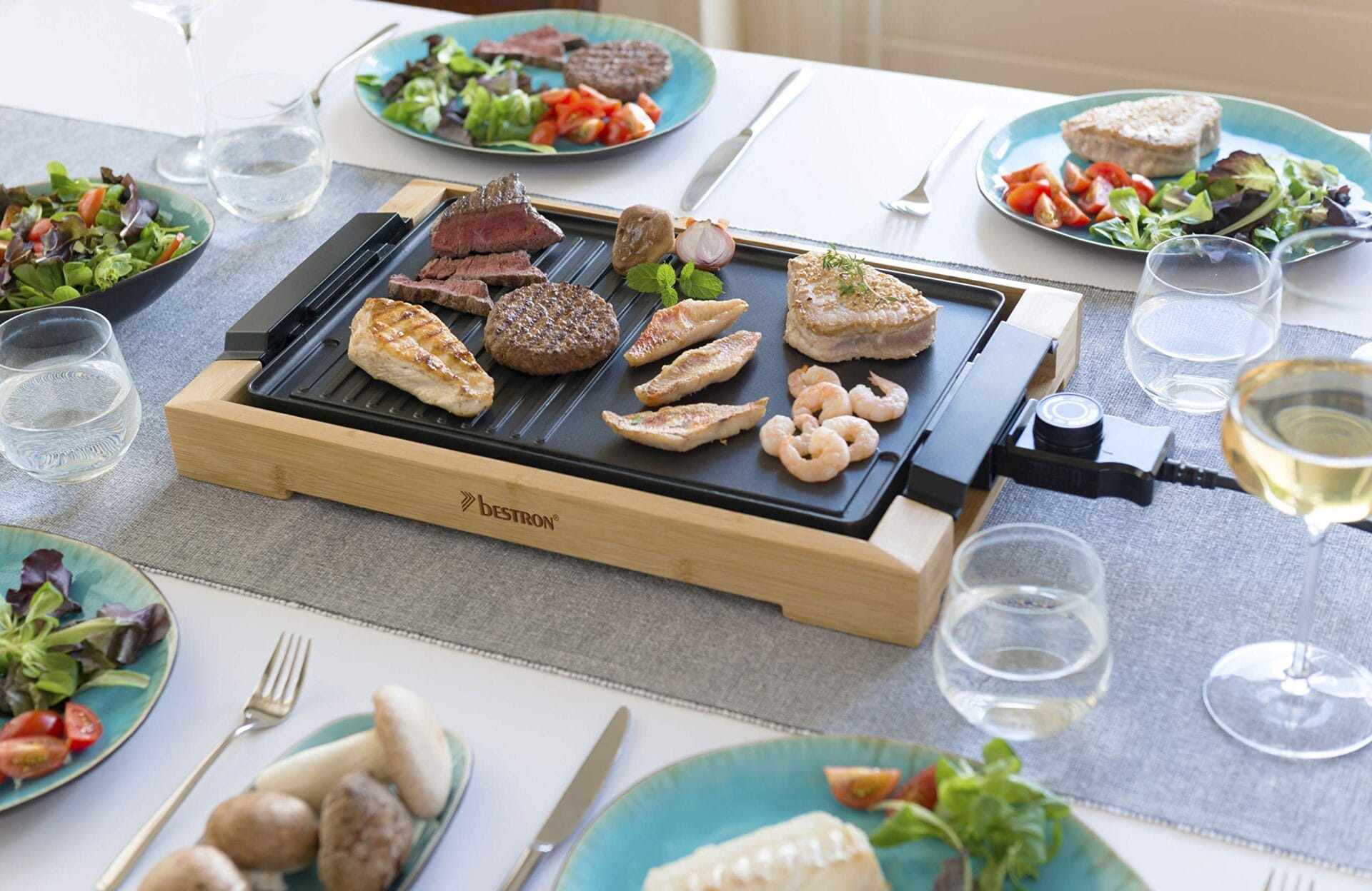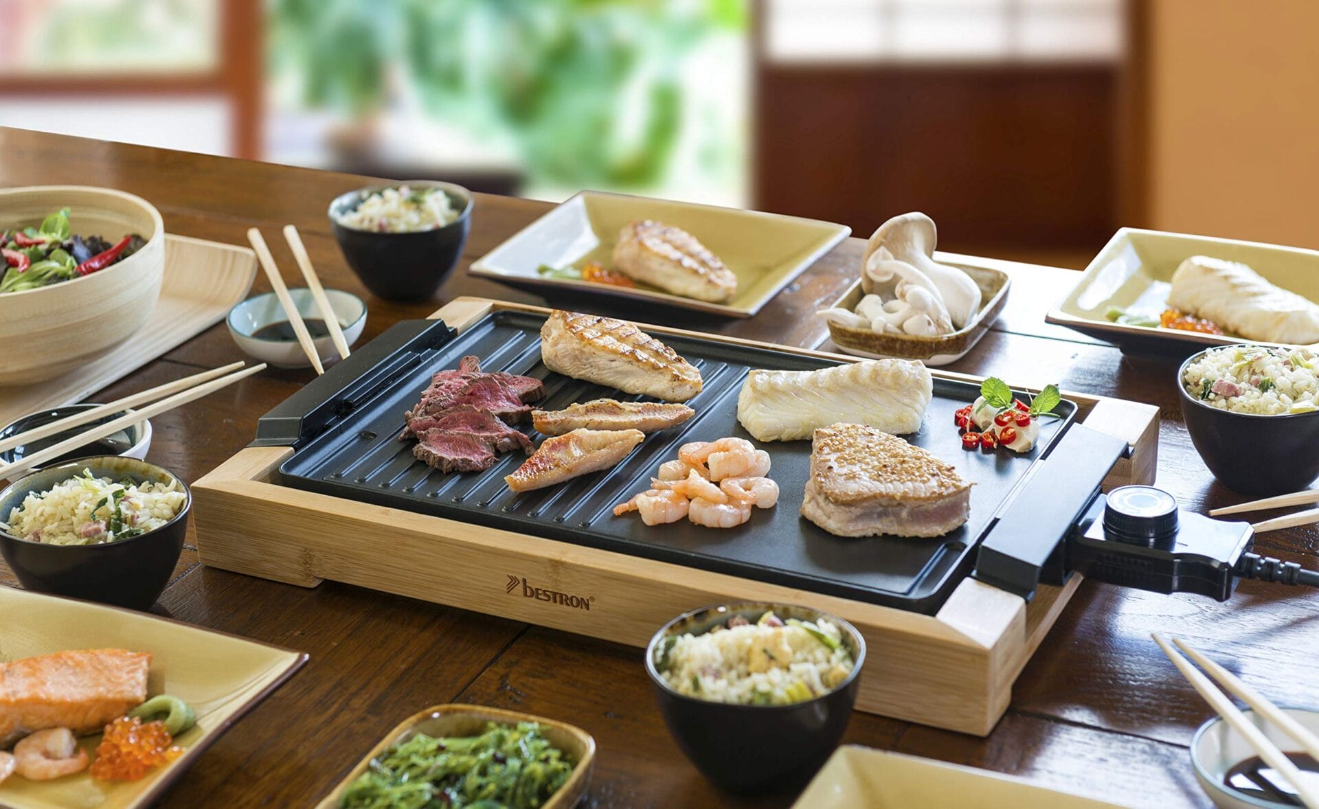 Ten elektryczny grill stołowy Bestron AG2000BB Teppanyaki płyta grillowa z obudową bambusową jest idealny do grillowania potraw w stylu Teppanyaki zarówno wewnątrz, jak i na zewnątrz, podczas przyjemnych grillowych wieczorów w ogrodzie lub na balkonie.