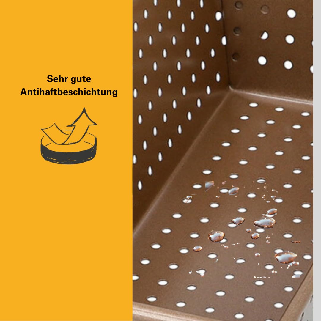 ✅ Materiał: pierwszorzędna, perforowana: Materiał: pierwszorzędna, perforowana stal węglowa z markową powłoką zapobiegającą przywieraniu o stabilnej jakości. Odporna na temperaturę do 230°C. Łatwe czyszczenie ręczne, nie nadaje się do mycia w zmywarce.