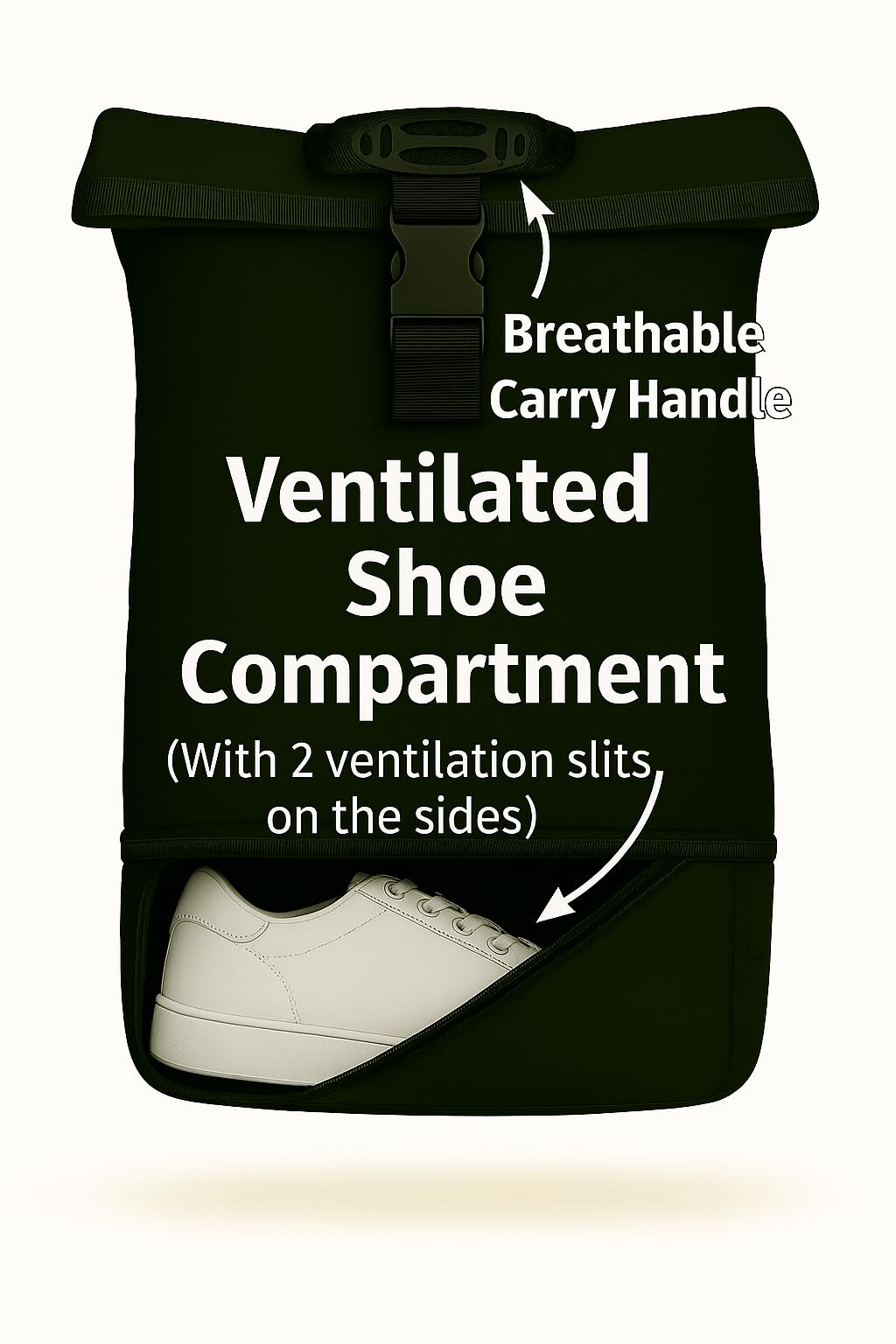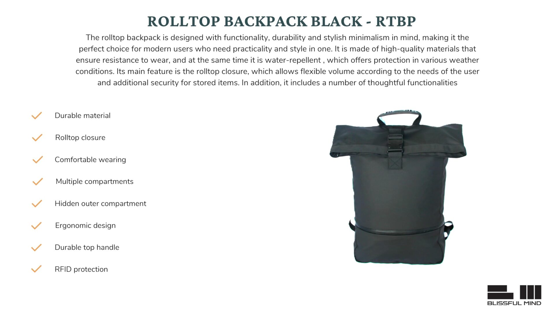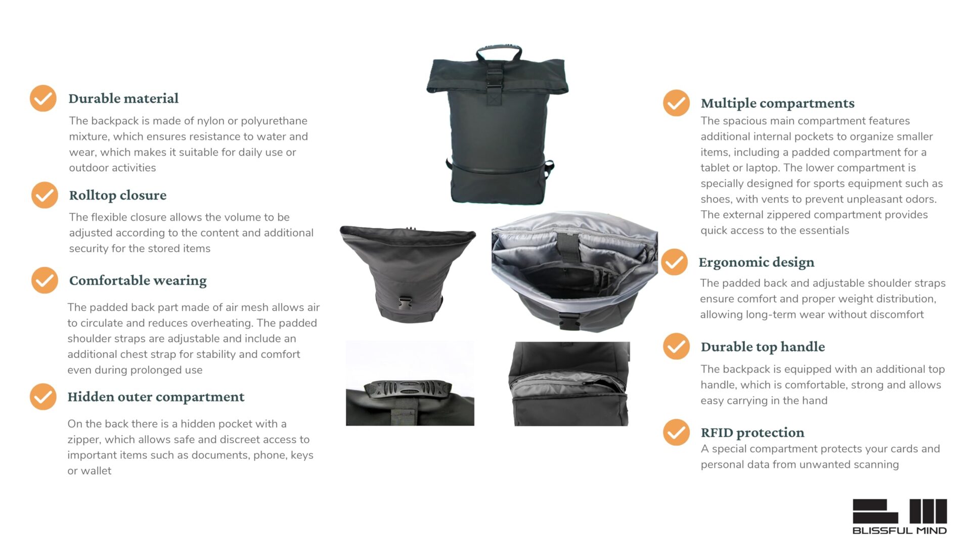 BLISSFUL MIND Plecak rolltop – Wodoodporny plecak na laptopa z wentylowaną kieszenią na buty, ochroną RFID i pasem piersiowym – Czarny – Laptop do 16 cali