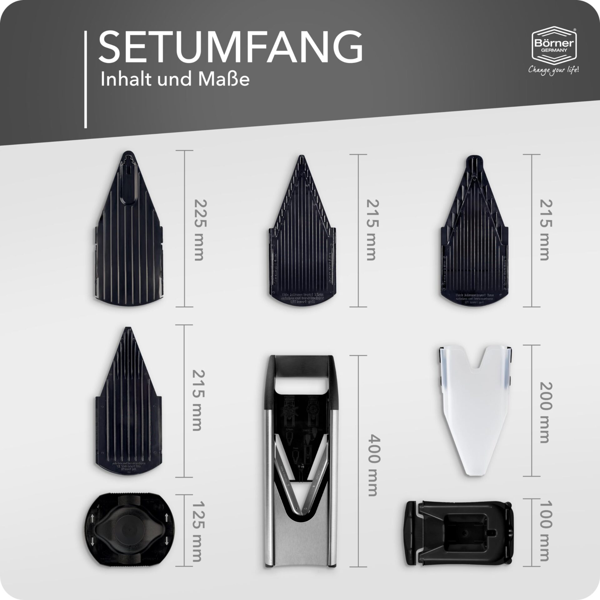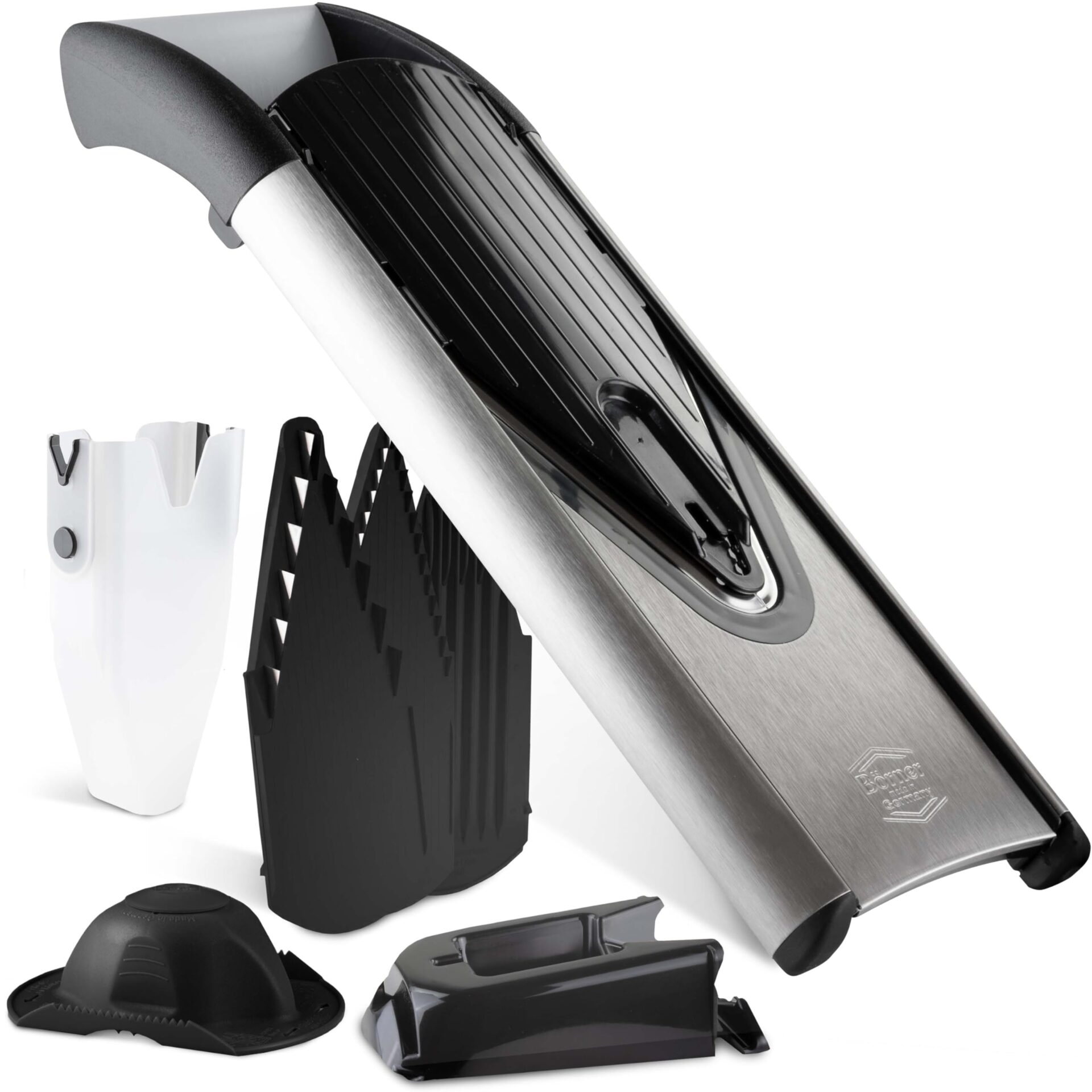 The Börner V6 ExclusiveLine professional vegetable slicer is perfect for slicing vegetables, onions, and fries with ease. This sleek black and silver slicer is a must-have for any kitchen. Get yours today and make meal prep a breeze!