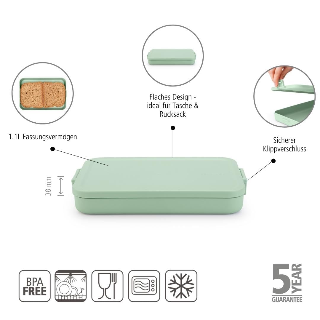Brabantia – Make & Take Pojemnik na Lunch – Płaski – Miejsce na Kanapki – Pokrywka z Klipsami – Nadaje się do Zamrażarki, Zmywarki & do Mikrofalówki – Jade Green – 26 x 16,6 x 3,7 cm