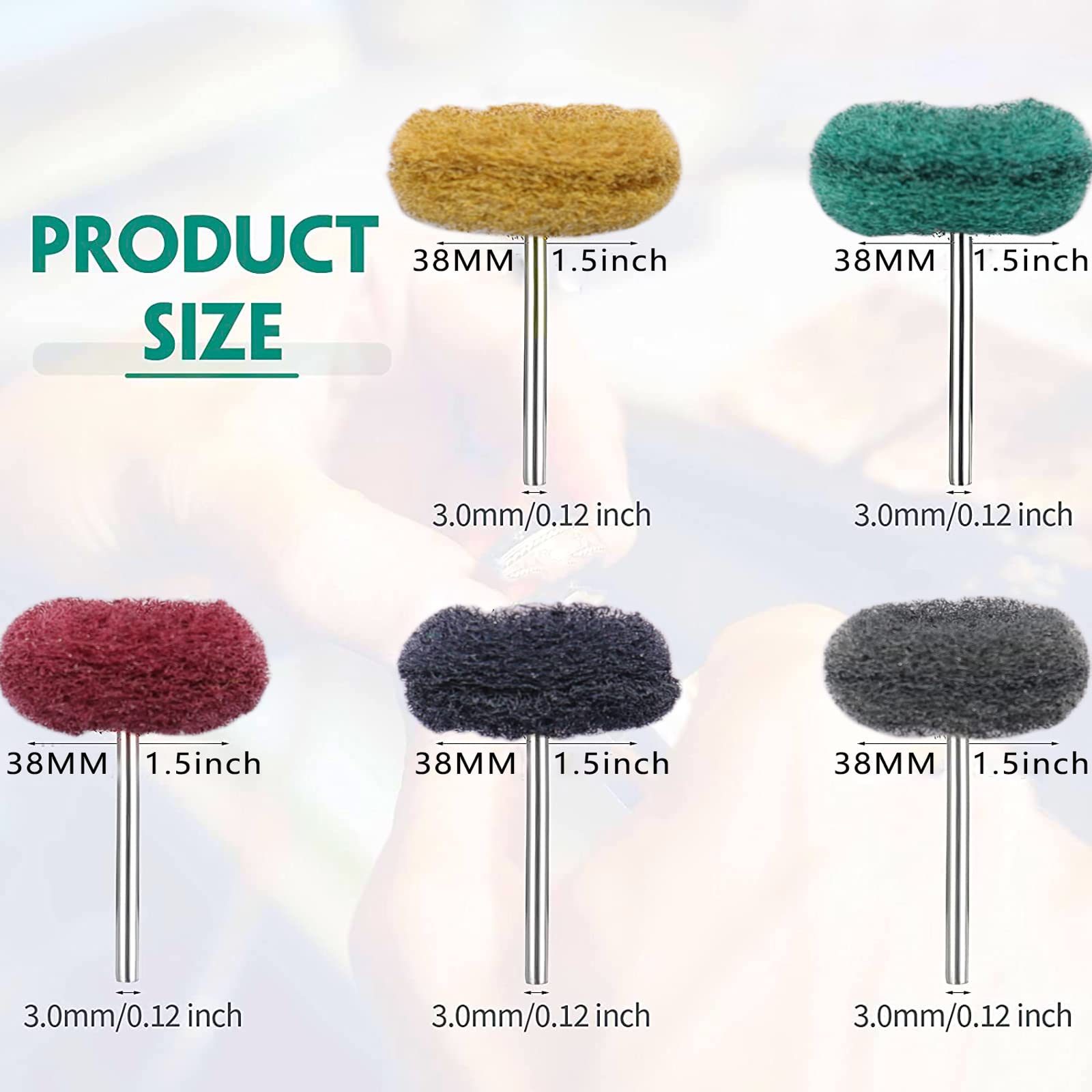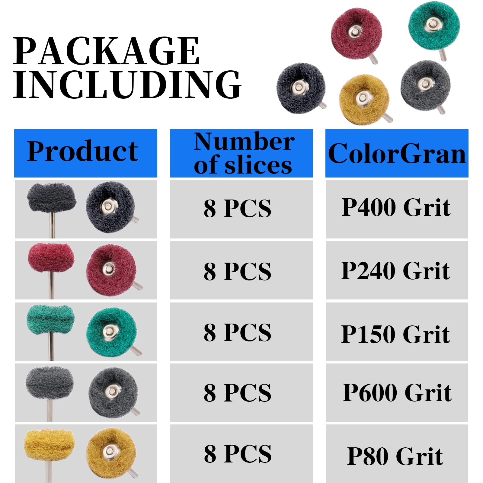 • 【5 różnych rozmiarów】Średnica trzpienia: 3 mm. Średnica tarczy polerskiej: 25 mm. 5 rodzajów ziaren: 80 ziaren (żółty), 150 ziaren (zielony), 240 ziaren (czerwony), 400 ziaren (czarny) i 600 ziaren (szary), do codziennego użytku.