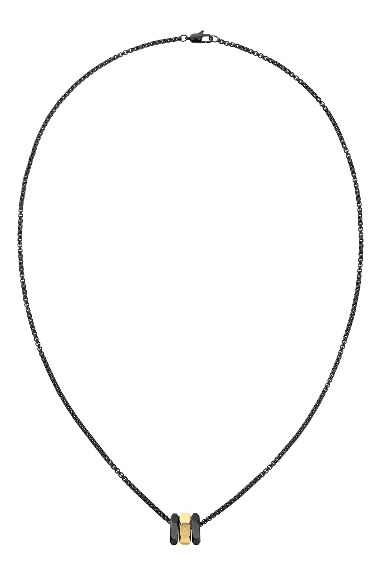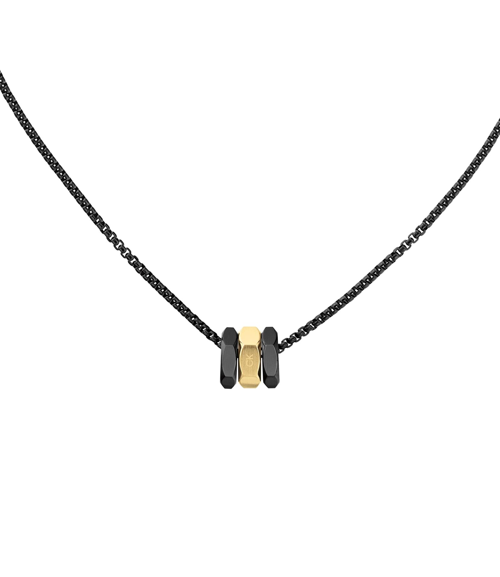 • Utylitarny, odważny styl, Neckace, który oferuje 3 elementy konstrukcyjne w kształcie sześciokątnym z pogrubionymi liniami, które emanuje industrialnym stylem • Materiał: Szczotkowana stal nierdzewna z czarnym i żółtym złotem jonowym (IP) • Długość naszyjnika: 61cm • Ozdobione wytrawionym logo CK • Zamknięcie: Lobster Claw Clasp