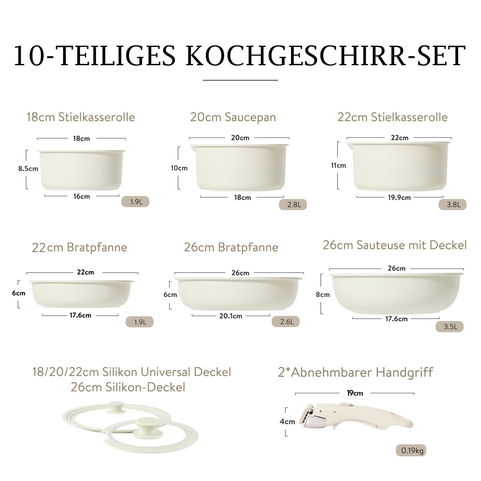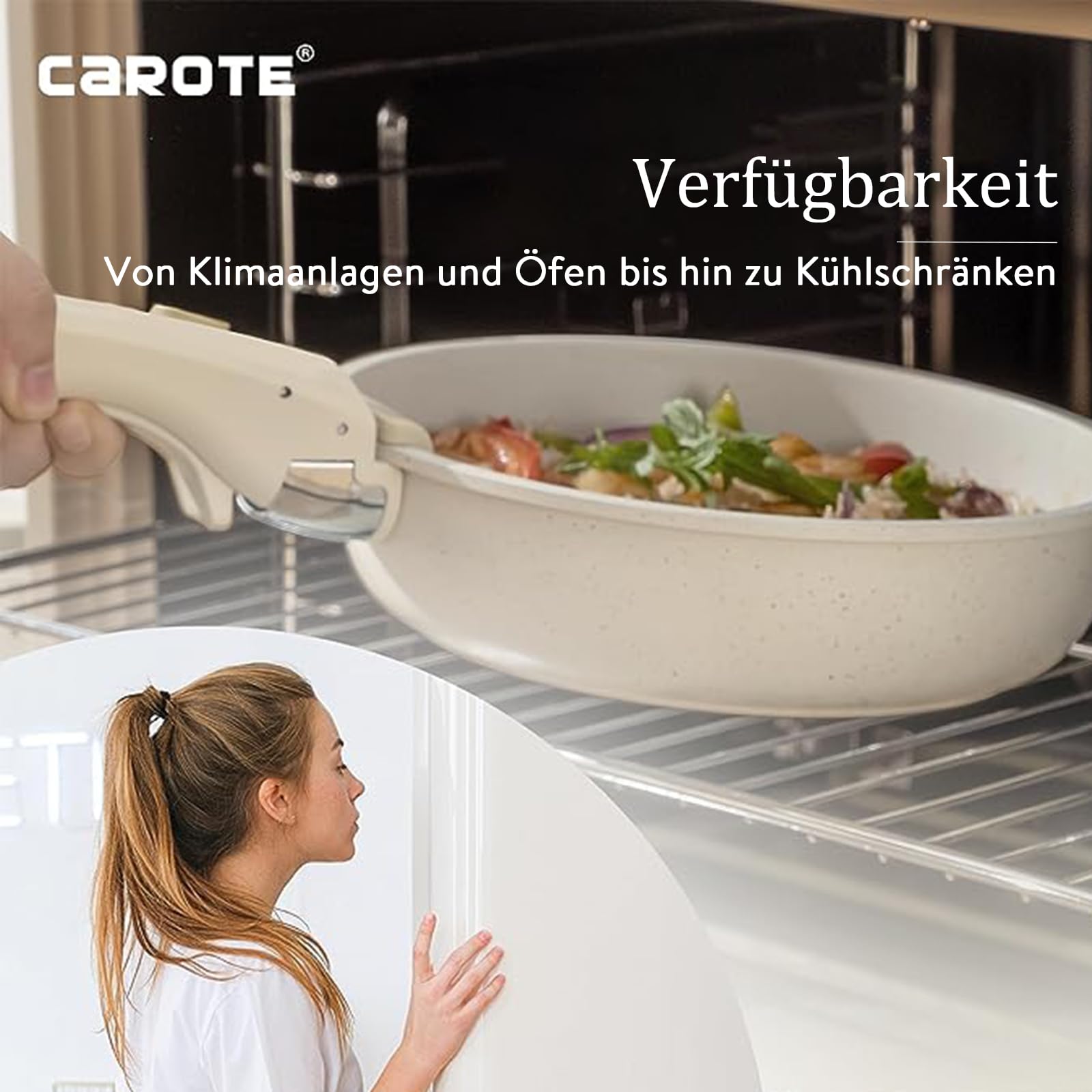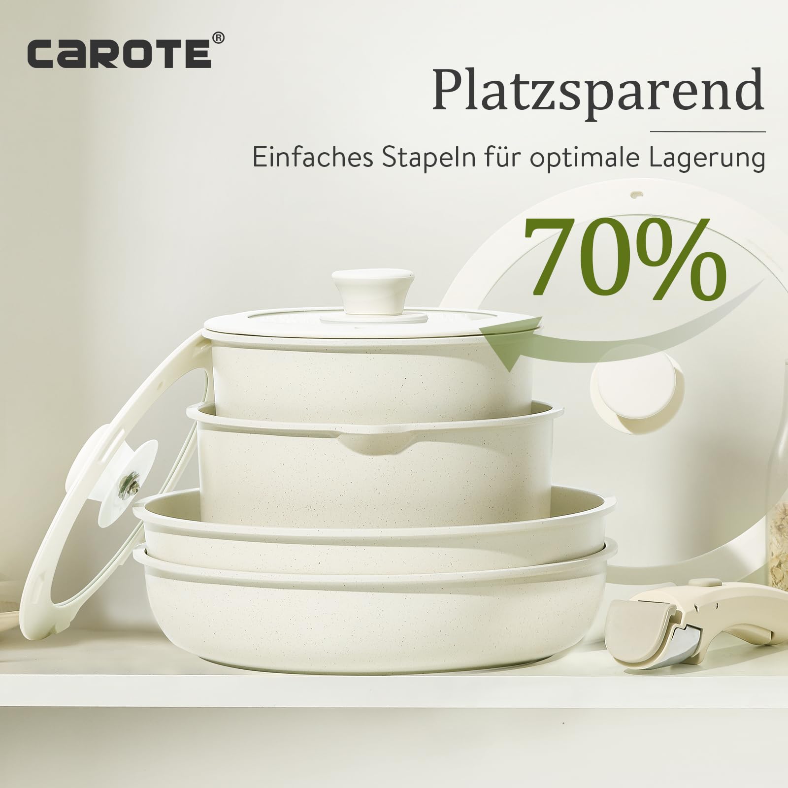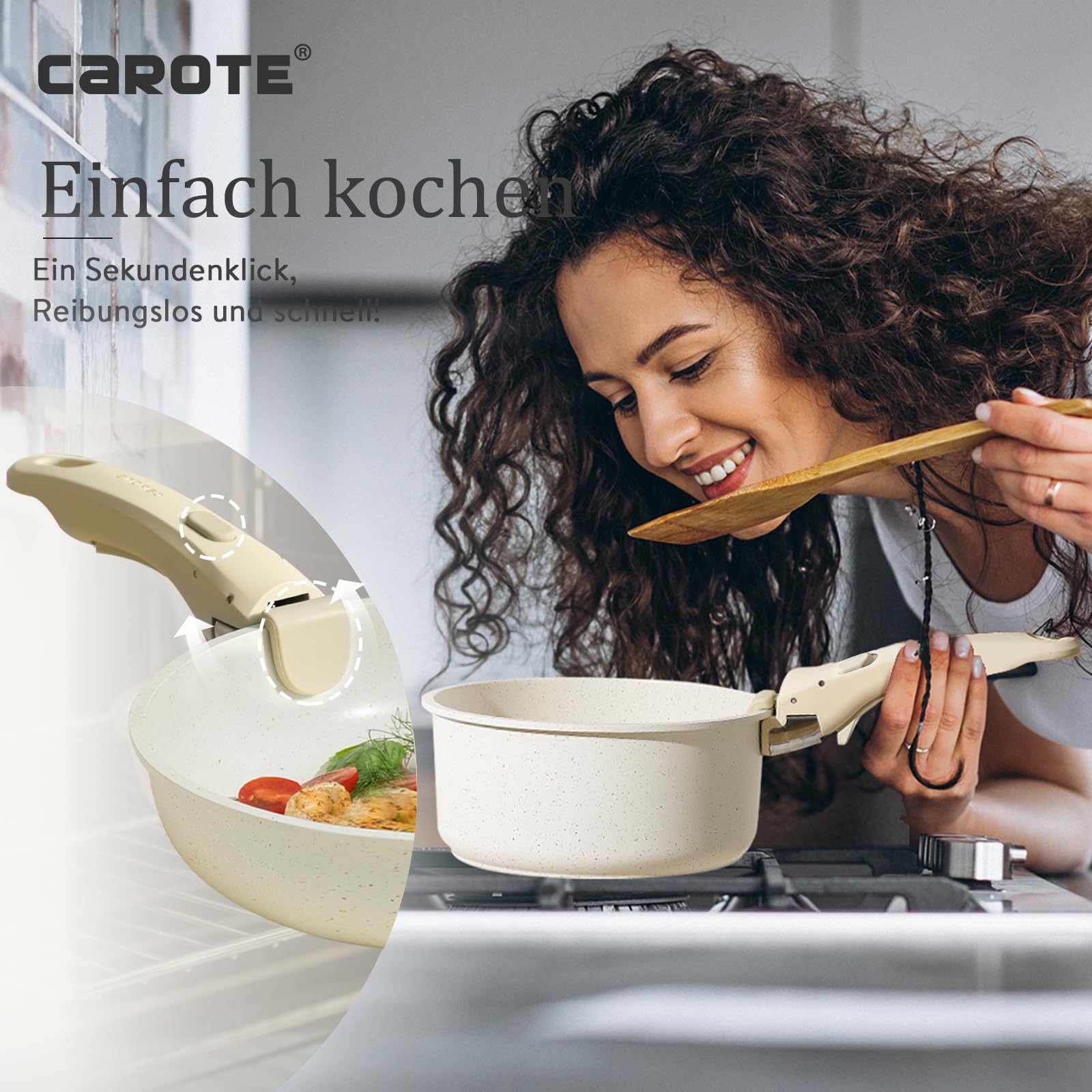 CAROTE Zestaw 10 nieprzywierających garnków i patelni ze zdejmowanym uchwytem to innowacyjne rozwiązanie dla każdego, kto ceni sobie wygodę i funkcjonalność w kuchni. Ten zestaw wyróżnia się na tle konkurencji dzięki unikalnym cechom, które sprawiają, że gotowanie staje się przyjemnością.