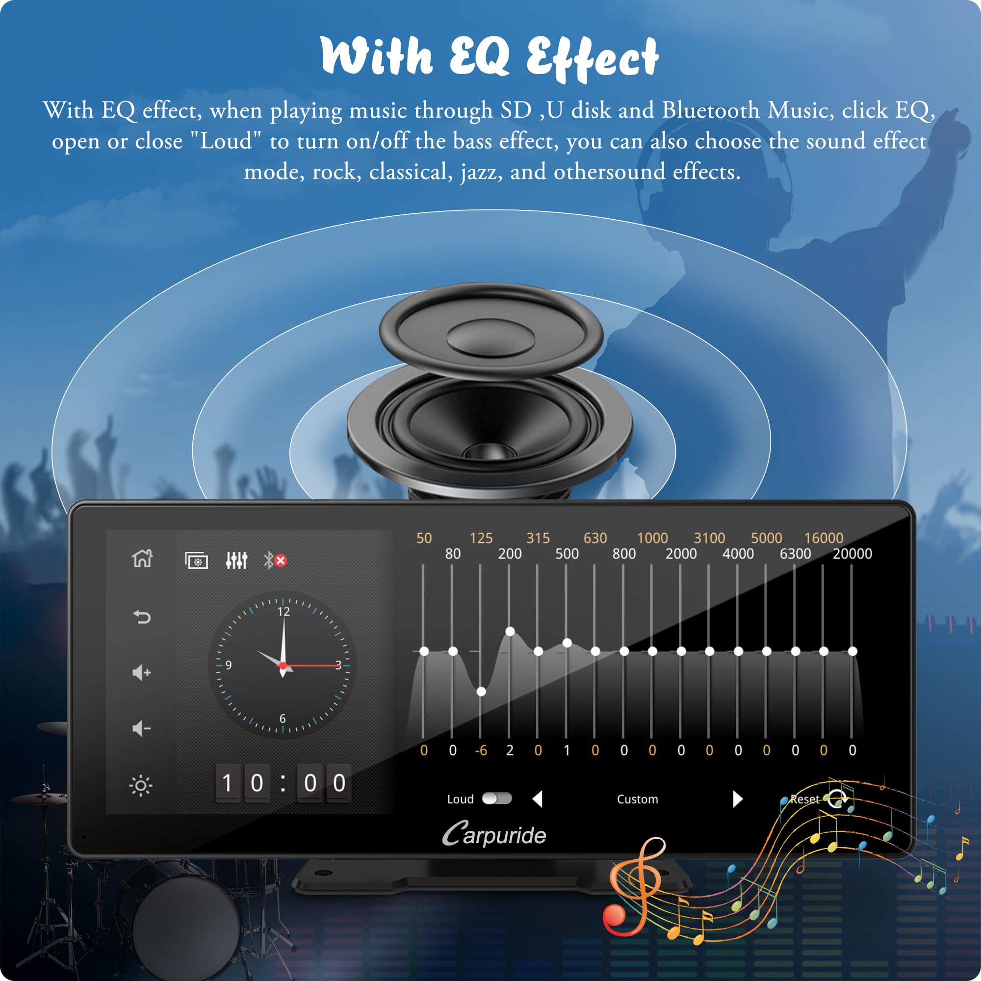 【Światło Czujnika i: 【Światło Czujnika i Korektor】 Światło czujnika chroni oczy podczas jazdy. Automatycznie rozjaśnia się podczas przejazdu przez tunele i przyciemnia wyświetlacz po wyjściu z niego. Korektor wyposażony jest w 16-pasmowy korektor HD z 12 sekcjami częstotliwości dla różnych stylów muzycznych i efektów dź