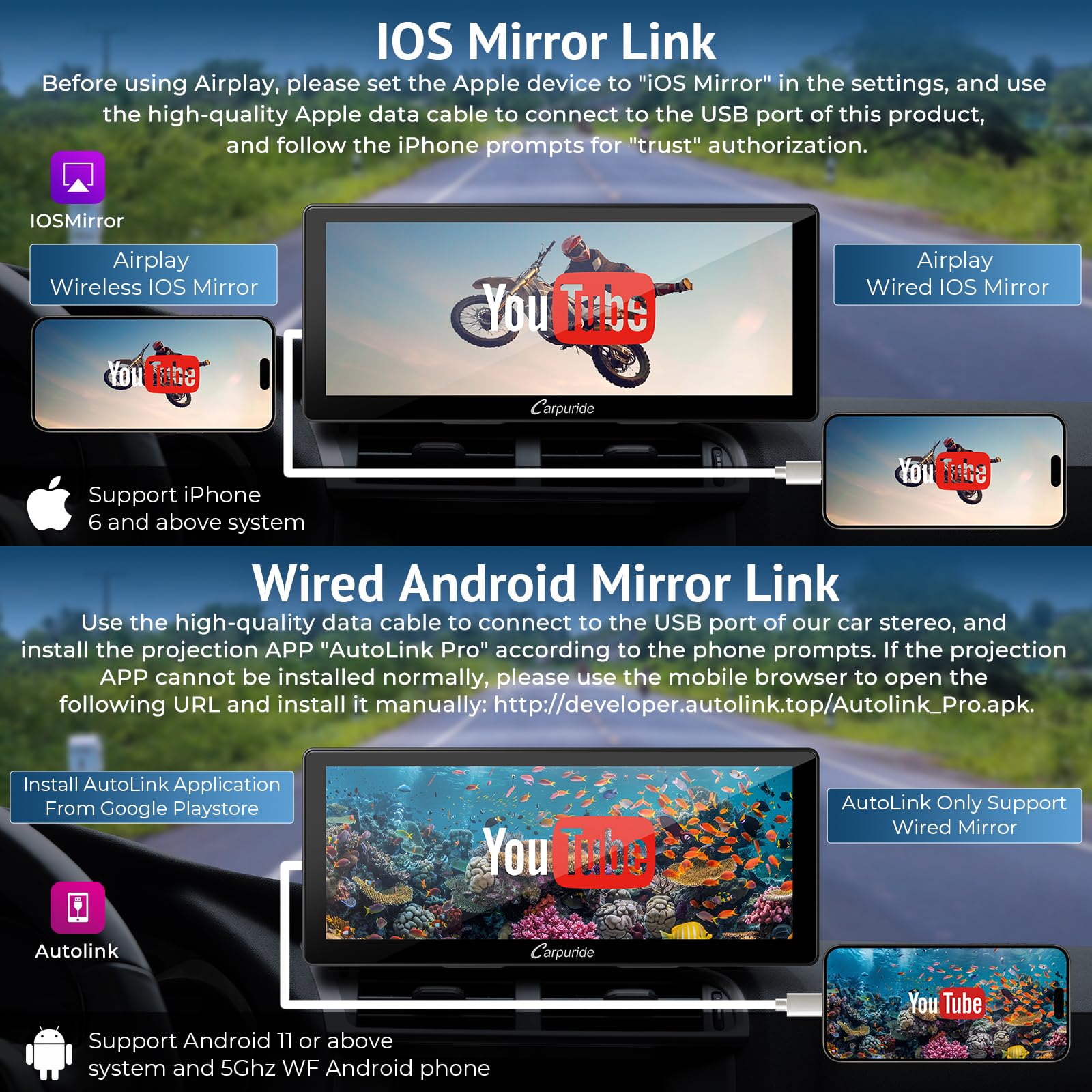 【Android/iOS Mirror-Link】 Carpuride: 【Android/iOS Mirror-Link】 Carpuride W103 Pro jest wyposażony w najnowszą technologię Phone Mirror-Link i jest kompatybilny z prawie wszystkimi telefonami z Androidem i iOS dla Mirror-Link. Dzięki tej funkcji możesz łatwo uzyskać dostęp do map nawigacyjnych, filmów z YouTube i ulubionej muzyki, a wsz