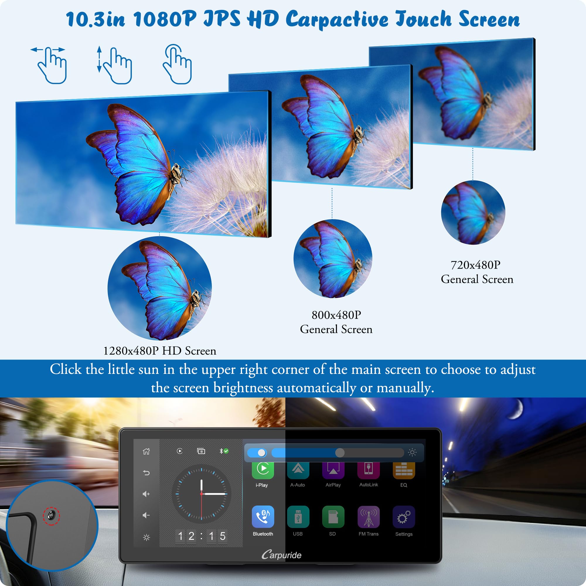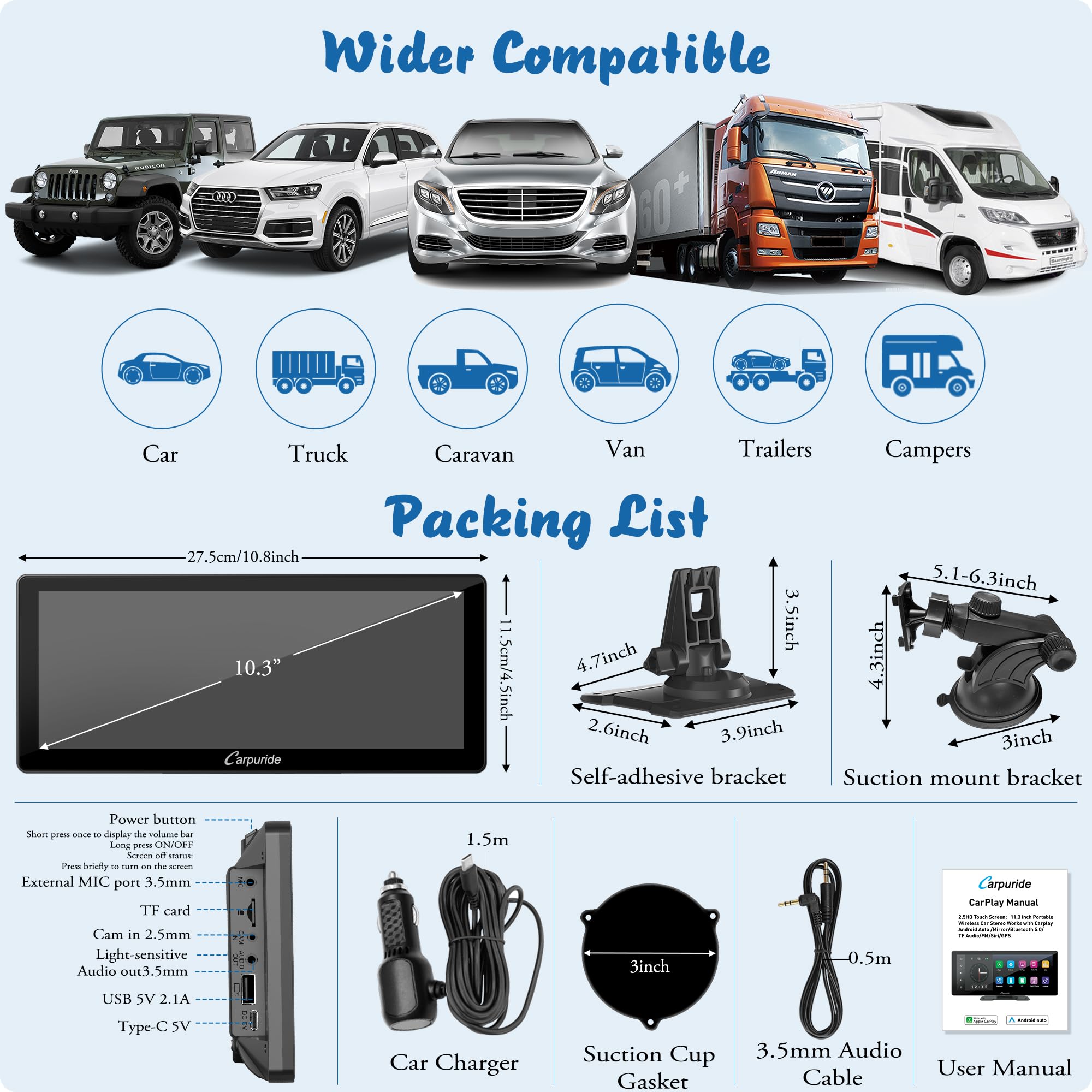 【Kompatybilny ze Wszystkimi: 【Kompatybilny ze Wszystkimi Modelami】 Samochodowy system audio Carpuride o przekątnej 10,3 cala jest zasilany z zapalniczki i ma zakres napięcia 12-24 V, dzięki czemu nadaje się do prawie wszystkich samochodów osobowych i ciężarowych, niezależnie od ich roku i modelu. Należy pamiętać, że właściciele