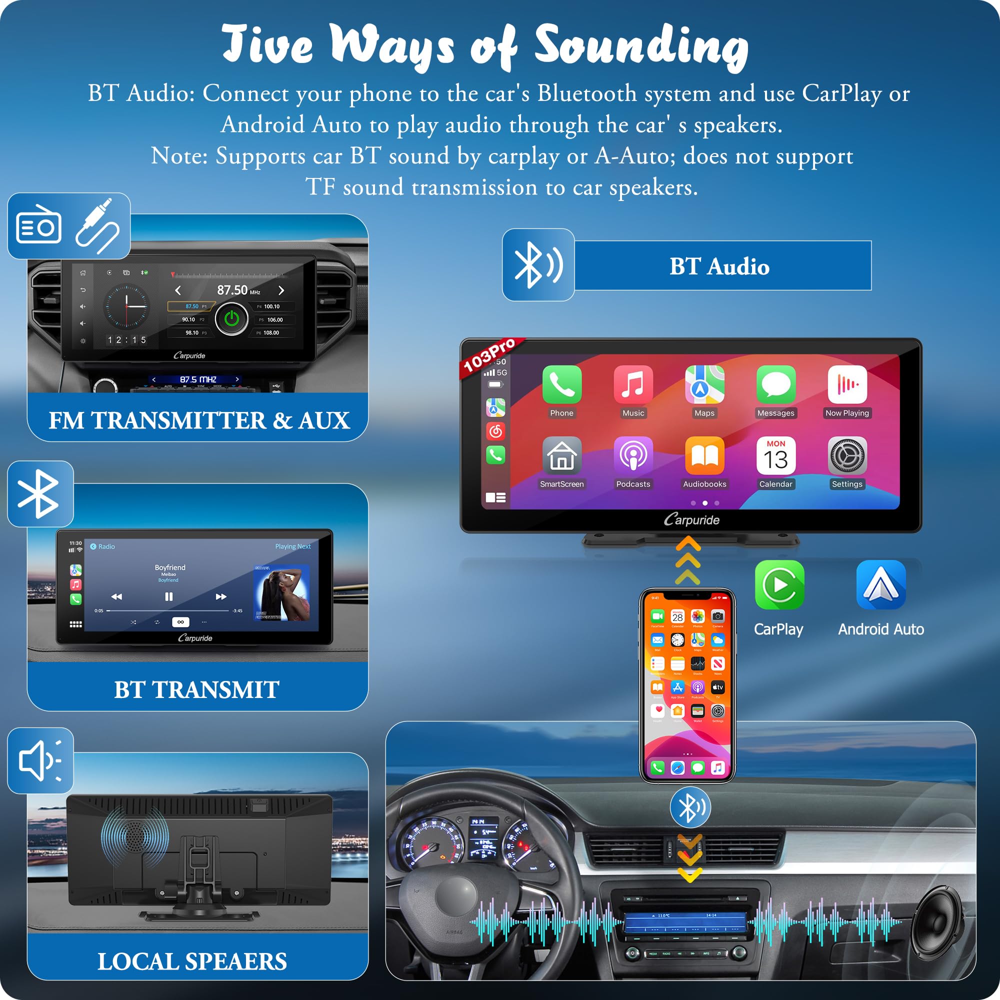 【Transmisja Bluetooth Zapewniająca: 【Transmisja Bluetooth Zapewniająca Lepsze Wrażenia Słuchowe】 Carpuride W103 Pro ma podwójną konstrukcję Bluetooth, która umożliwia Bluetooth 5.0 bezprzewodowe korzystanie z funkcji zestawu głośnomówiącego i zestawu głośnomówiącego po podłączeniu do smartfona. Nadajnik Bluetooth umożliwia podłączenie