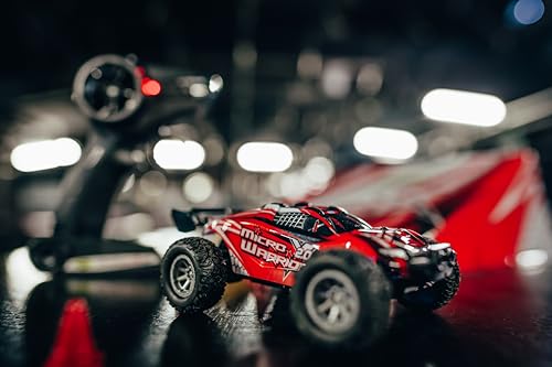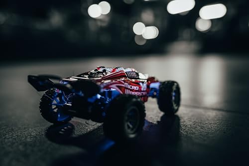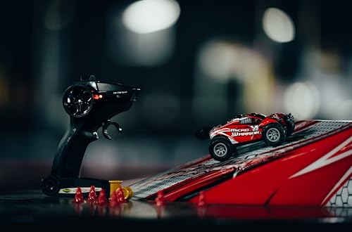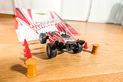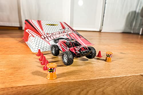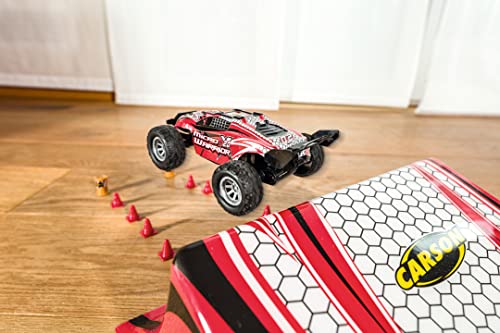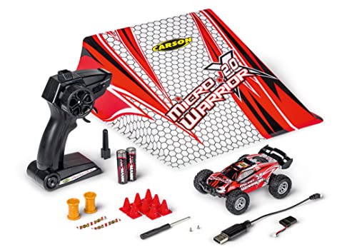 Carson 500404225 1:32 Micro X-Warrior 2.0 2.4G 100% RTR zdalnie sterowany to mały, ale potężny samochód RC w skali 1:32, idealny do jazdy w domu i ogrodzie. Ten łatwy w obsłudze dwukołowy buggy RC ma dwie prędkości do 30 km/h i jest niezwykle zwrotny. Dzięki przyczepności gumowych opon zawsze masz odpowiednią przyczepność nawet na nierównych powierzchniach. W zestawie znajduje się skocznia, która pasuje do wyglądu samochodu, 2,4 GHz 3-kanałowa radiostacja, akumulator LiPo, narzędzia i kilka pylonów do budowy toru wyścigowego. Po długim czasie jazdy wynoszącym 15 minut, możesz łatwo naładować ten mały samochodzik za pomocą kabla USB. Kupuj, ładować, jeździć!
