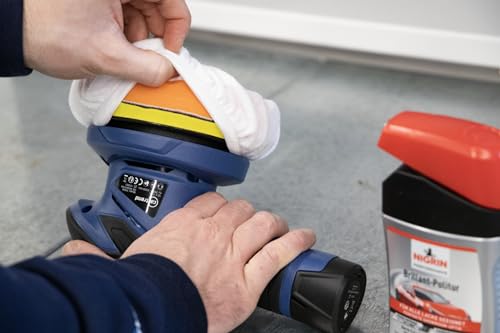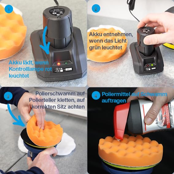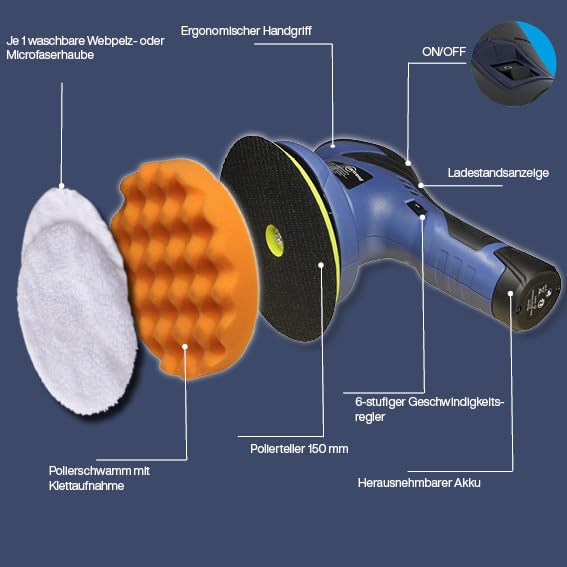 - Dołączone komponenty: 1 x gąbka polerska z zapięciem na rzepy, osłona bawełniana, mikrofibra elastyczna guma, akumulator 12 V, 2000 mAh, stacja ładująca wskaźnik stanu 1 x