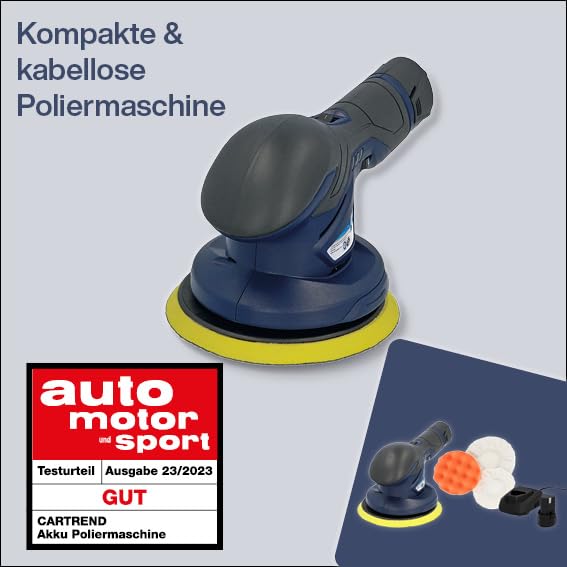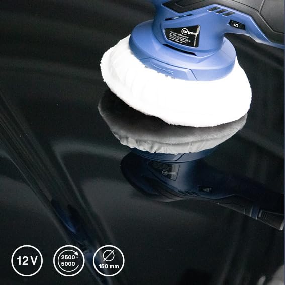 cartrend Akumulatorowa maszyna do polerowania, 2500 – 5000 obr./min (6 stopni), wymienne akumulatory 12 V, 2 x nakładki polerskie, 1 x gąbka polerska, cicha praca, średnica talerza 150 mm